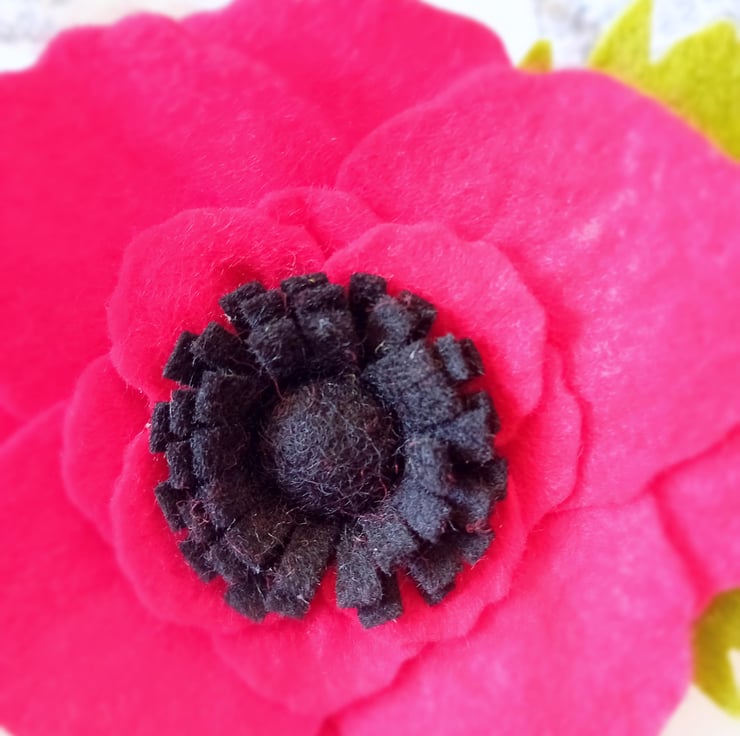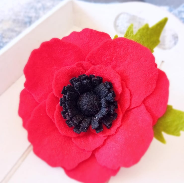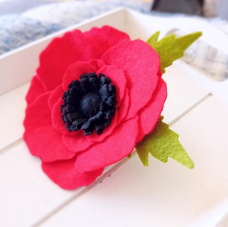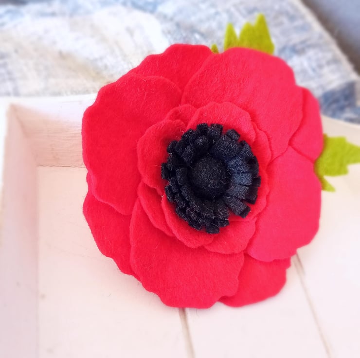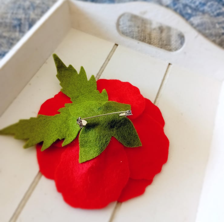 Handmade Felt Poppy brooch measuring up to 5 inches in diameter, including the leaves.
