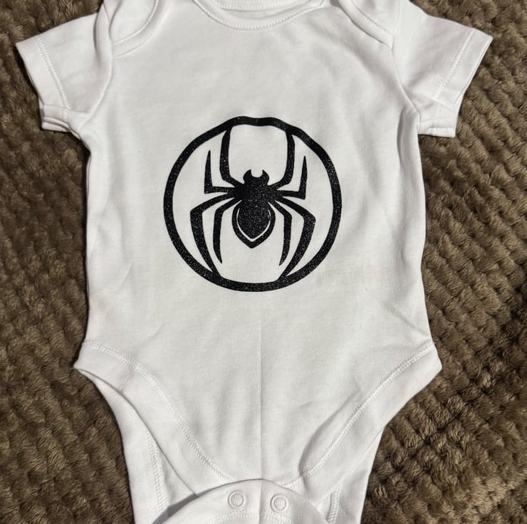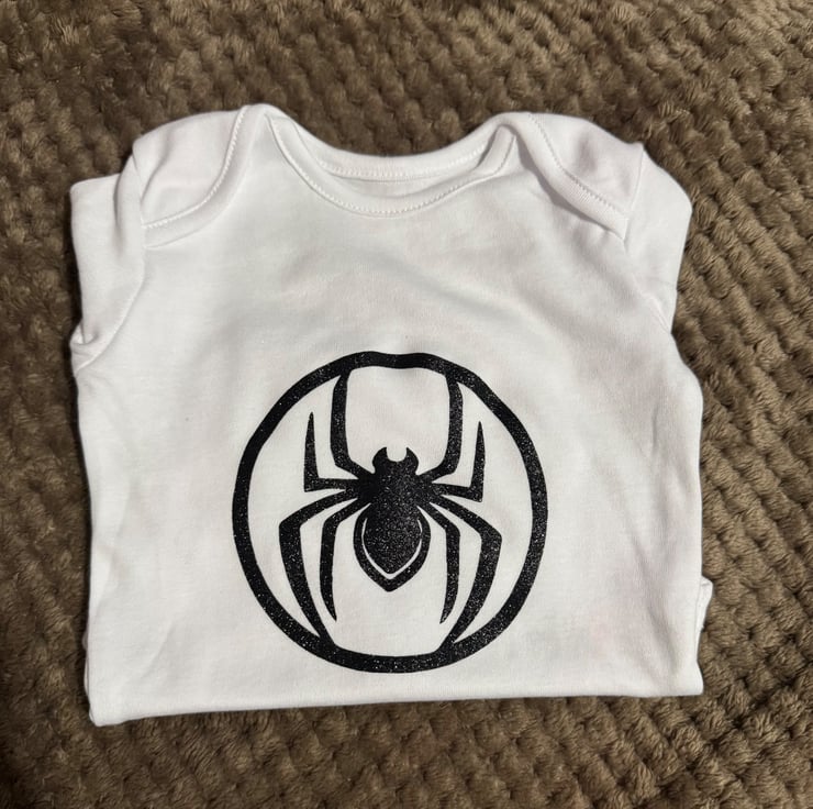 This soft white onesie features a striking black spider emblem front and center, adding a fun, superhero-inspired vibe while keeping things simple and stylish. Made from comfortable, breathable fabric, it's perfect for everyday wear, photos, or a unique gift.