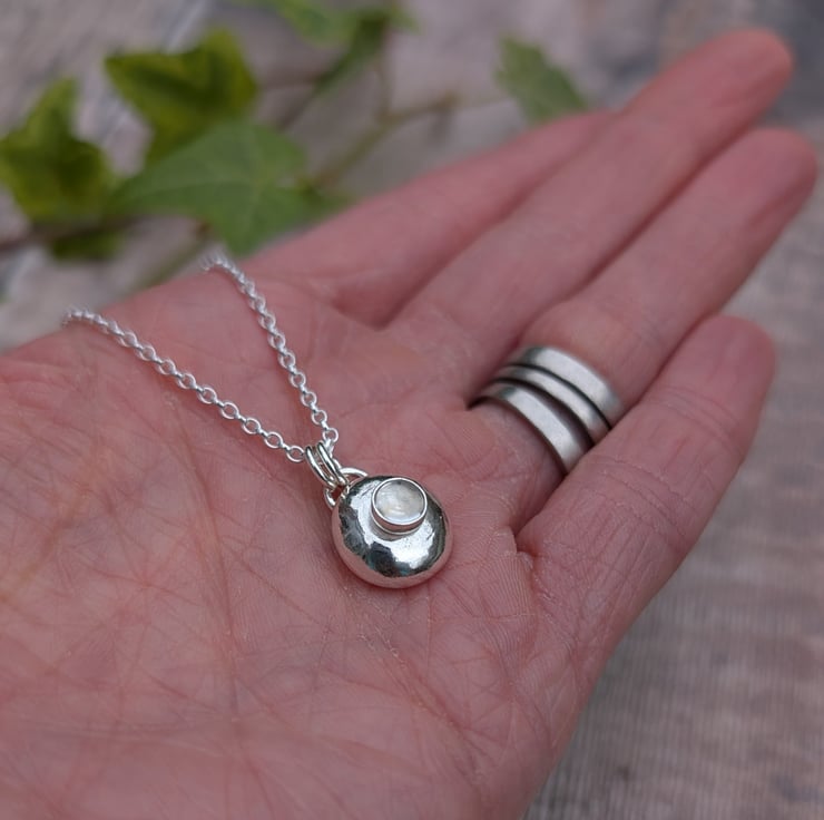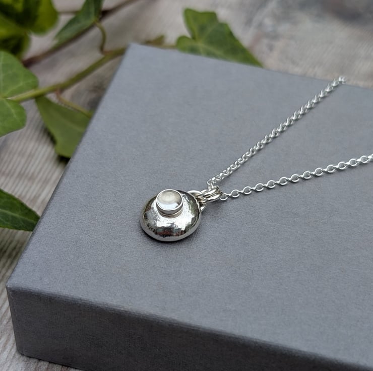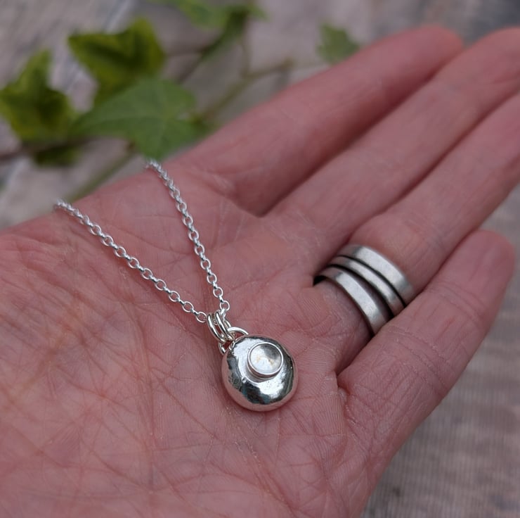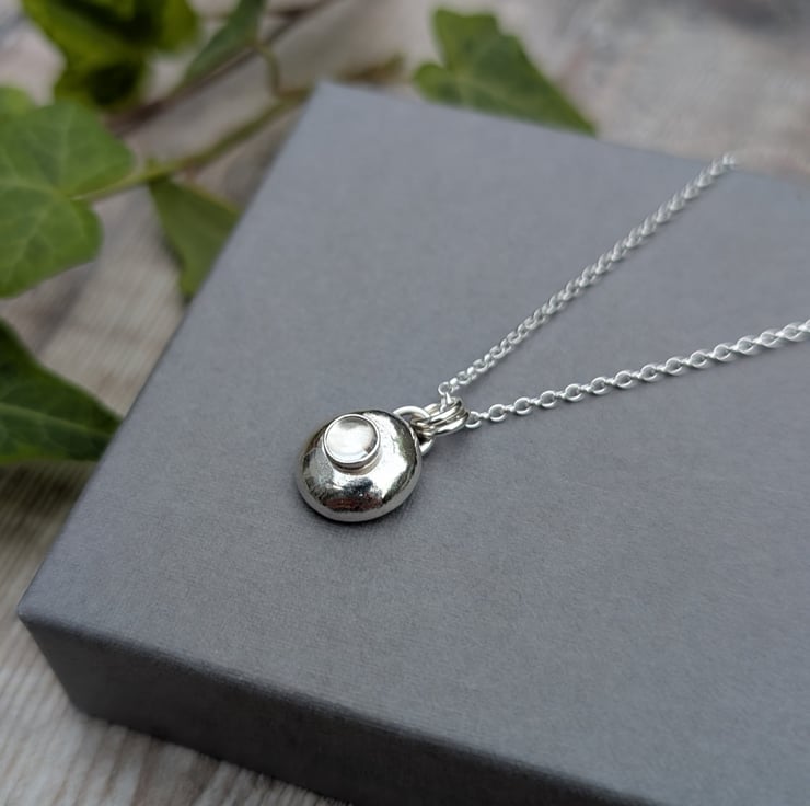 The Silver Pebble Necklace with Crystal Quartz is handmade from recycled Sterling Silver, shaped into a soft, rounded pebble and polished by hand for a smooth, natural finish. A small Crystal Quartz stone is set into the centre, adding a gentle shine and subtle detail. Crystal Quartz is known for its clear, light appearance and is the birthstone for April, making this necklace a thoughtful gift or a simple piece to wear every day.