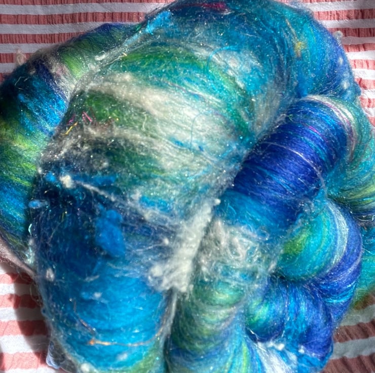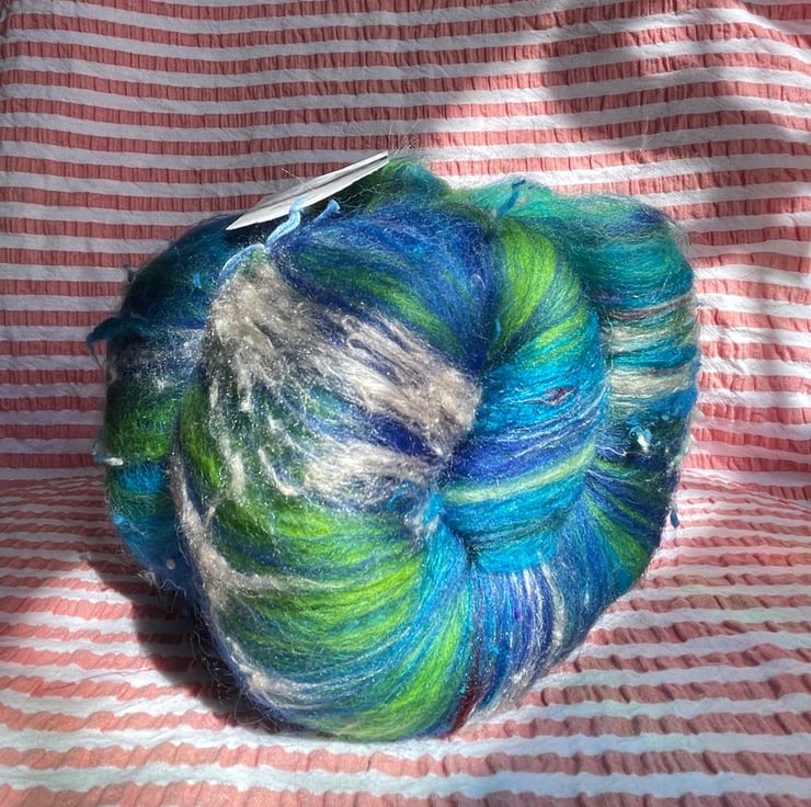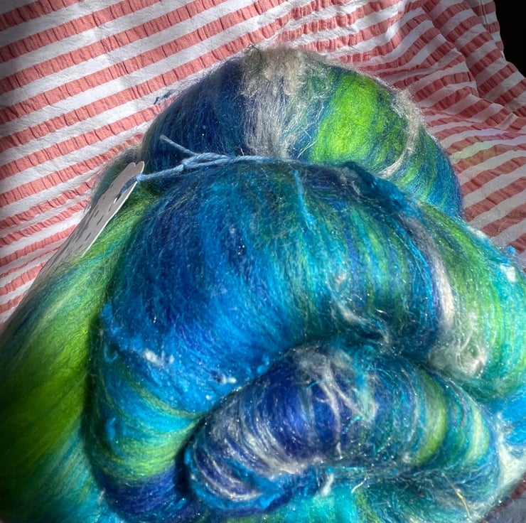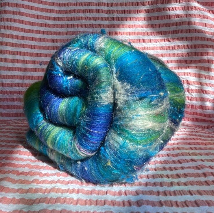 Green Moray Swims Away - Inspired by my favourite sea creature, the green moray eel.. this batt is a gorgeous mix of corriedale, merino, sari silk and mulberry silk noil.