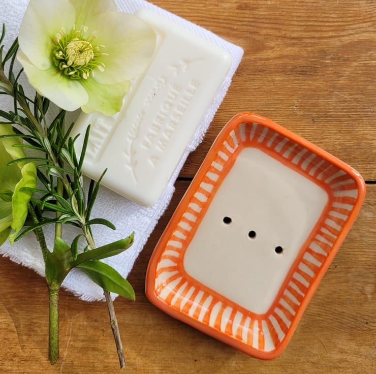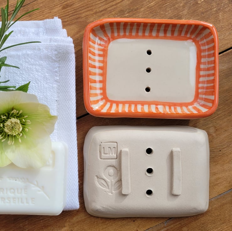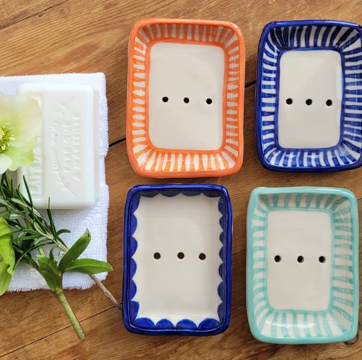 These dishes are small enough to fit on the edge of your sink, big enough for a small bar of soap! They have 3 drainage holes.