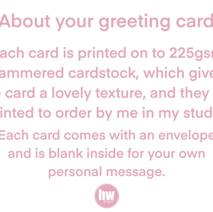Your greeting card is printed to order and is printed on 225gsm hammered card stock which gives the card a nice texture to it. Your card will be printed by me in my studio.