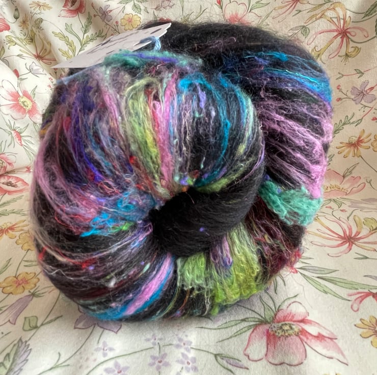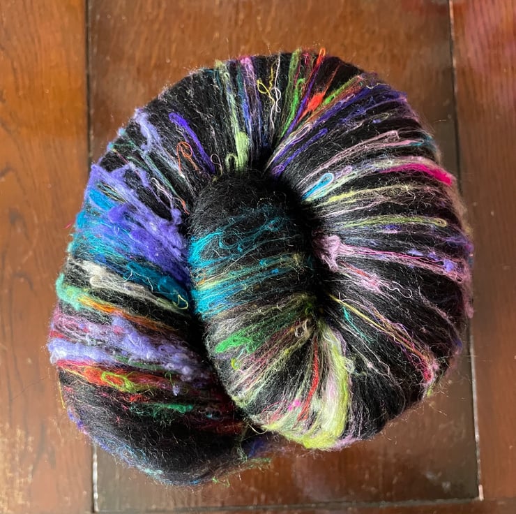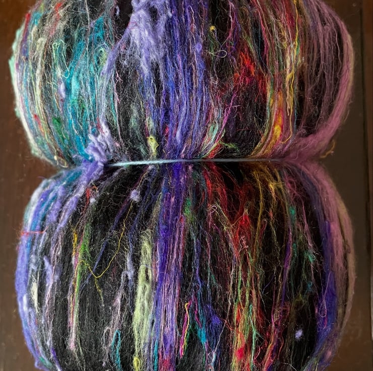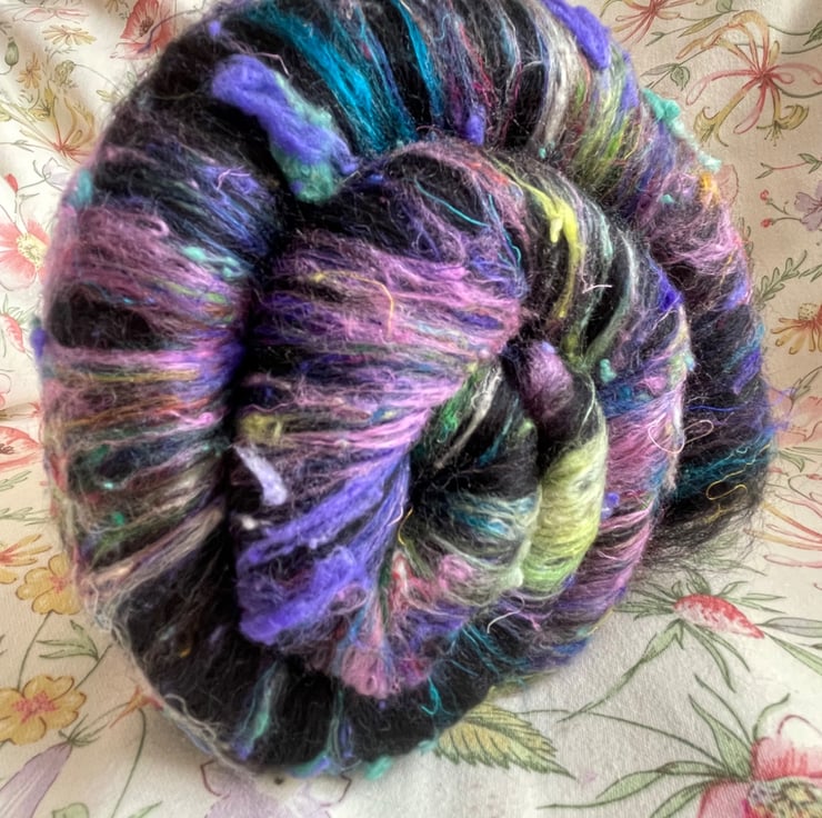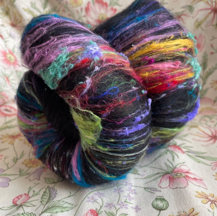 Firework - Inspiration exactly as you might imagine.. from fireworks!! This batt is a textural dream, with corriedale for stability and an ever changing mix of commercial and hand-dyed sari silk & mulberry silk noil. The batt is blended in four separate layers, so the silk is distributed thoroughly throughout and not just a surface decoration. The pictures shown are of various Firework blends that I have in stock, and not necessarily the exact batt you will receive.