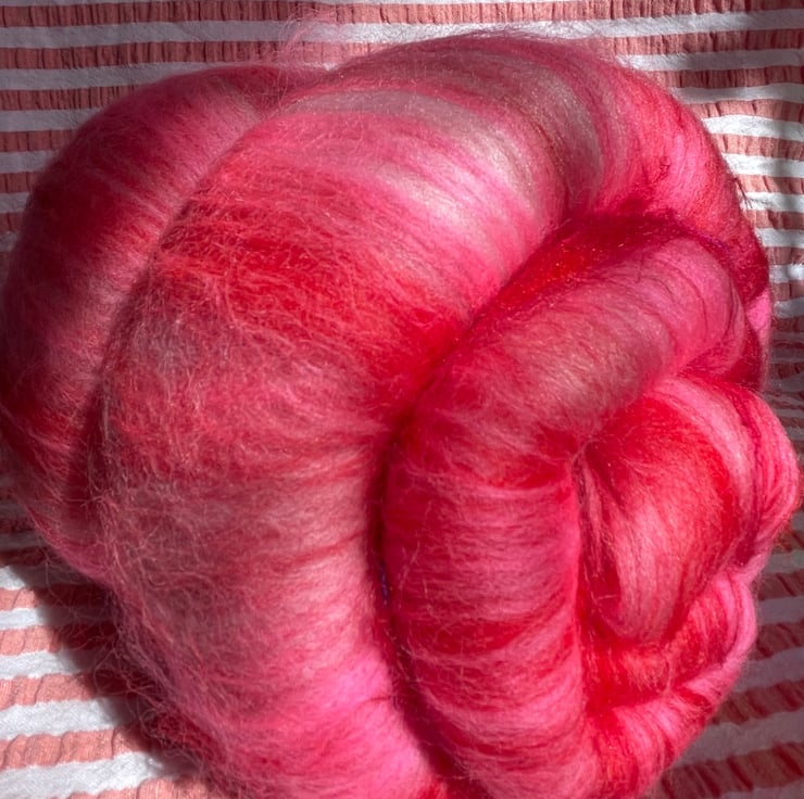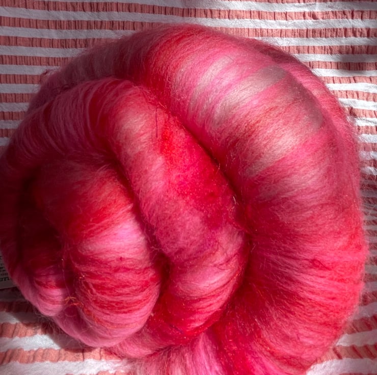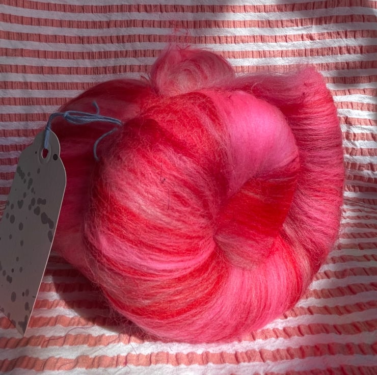 Valentine Be Mine - Inspiration comes from sugary sweet valentines bouquets and the irresistible urge to make every batt pink! Two shades of pink, one zingy orange-toned red and a dusting of red sari silk make for a beautiful mix which spins up into a pleasant yarn which isn't too overpowering.