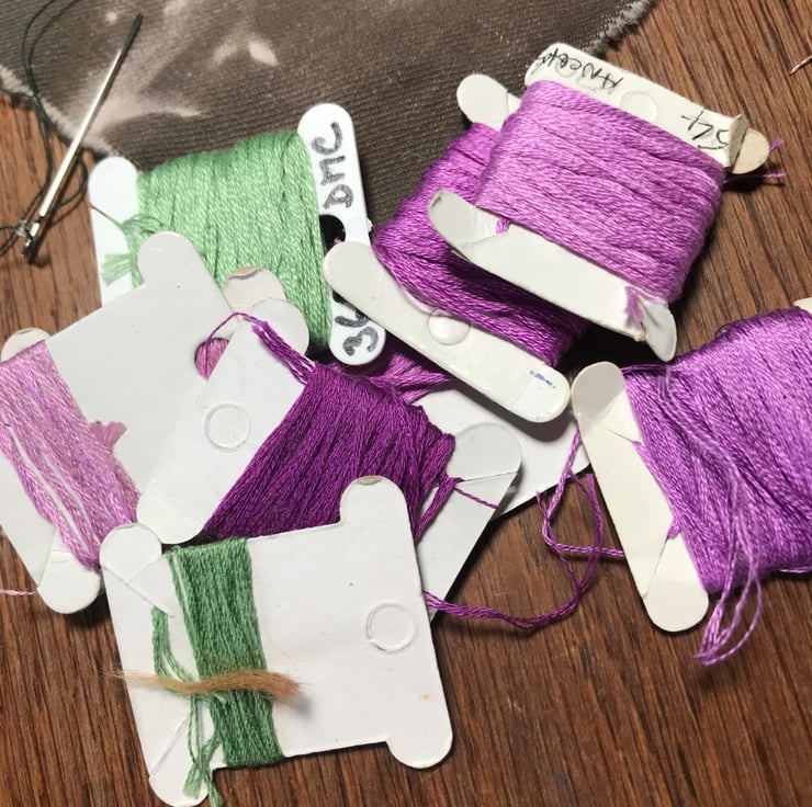 When I retrieved the cyanotype, I washed and bleached it in an ash bath. Then I toned it with leftover green tea. Finally I stitched on the Creeping Thistle with vintage threads and mounted into an unglazed frame.