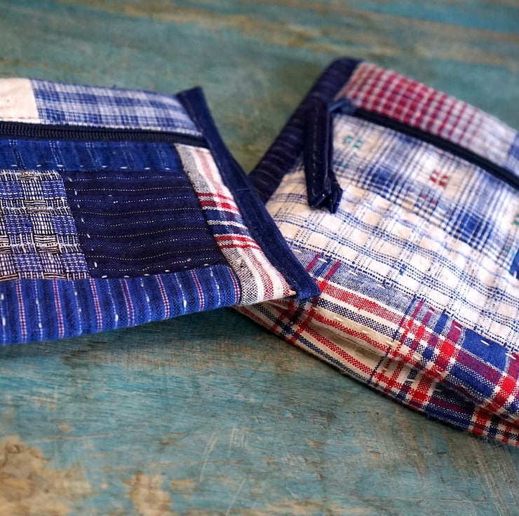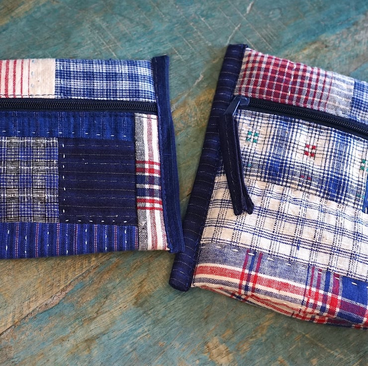Handmade from patchwork of vintage handwoven indigo cotton, each piece carries its own texture and history. The fabrics were woven many years ago on traditional wooden looms, and its subtle irregularities make every pouch unique.