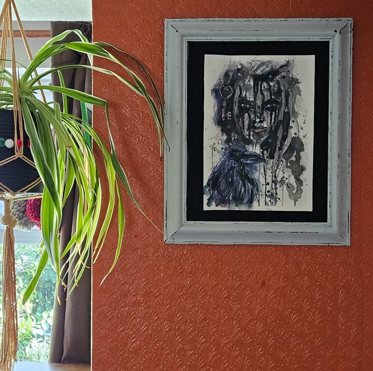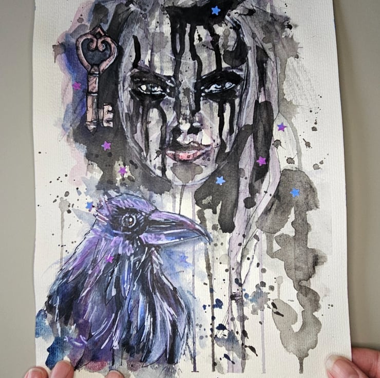 Her face emerges from washes of black violet, and storm grey ink, contrasted by the luminous raven who watches over her. The key she carries is a symbol of inner unlocking the truths you are finally ready to see. Scattered stars and soft splashes of colour add a dreamlike, magical atmosphere, making this piece perfect for lovers of folklore, witchy aesthetics, and intuitive art.