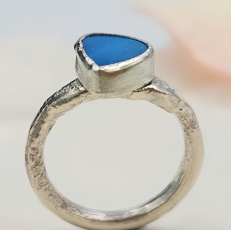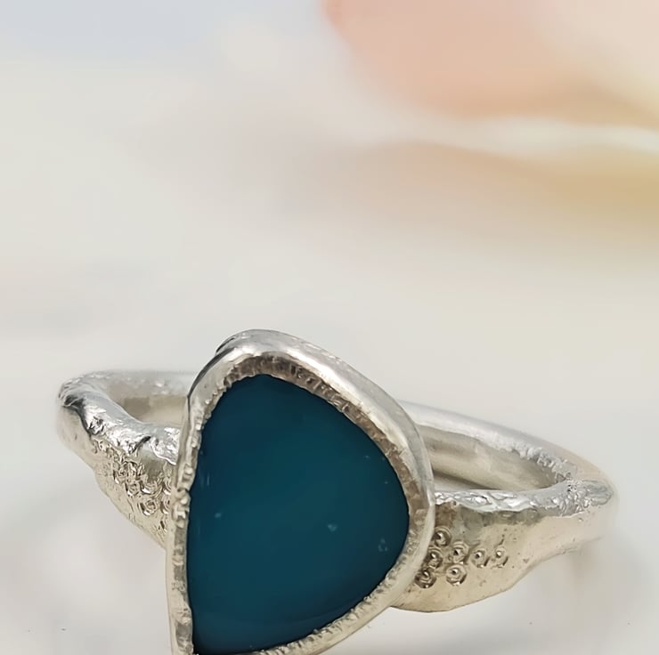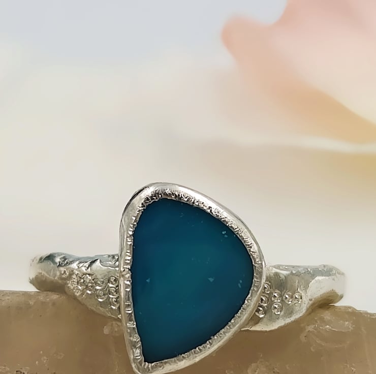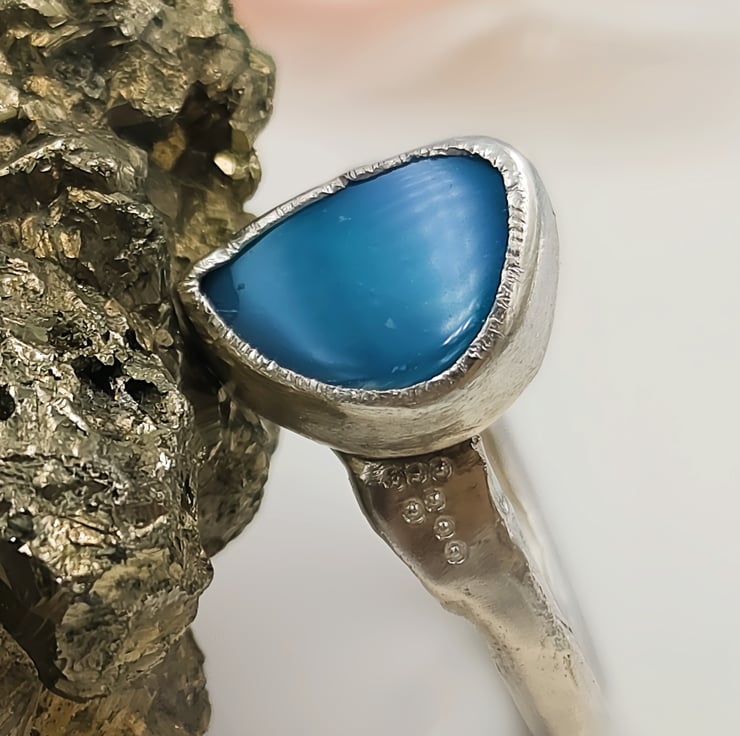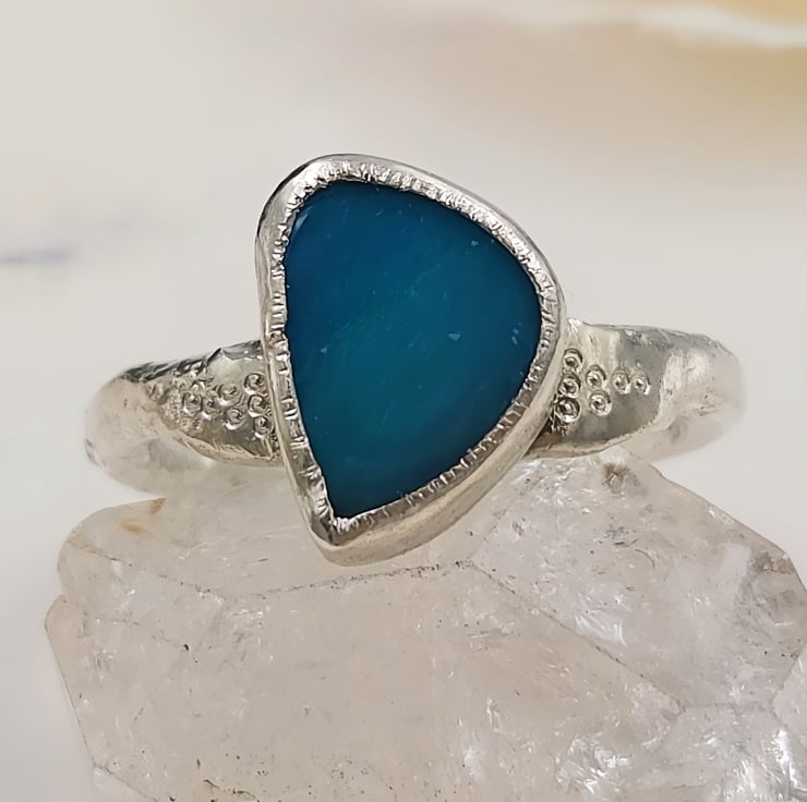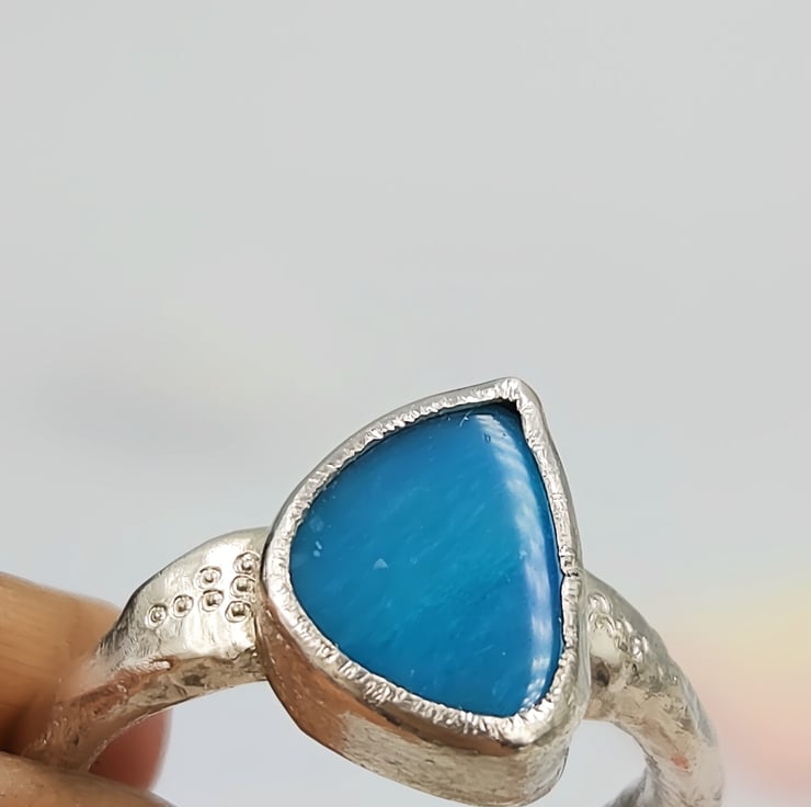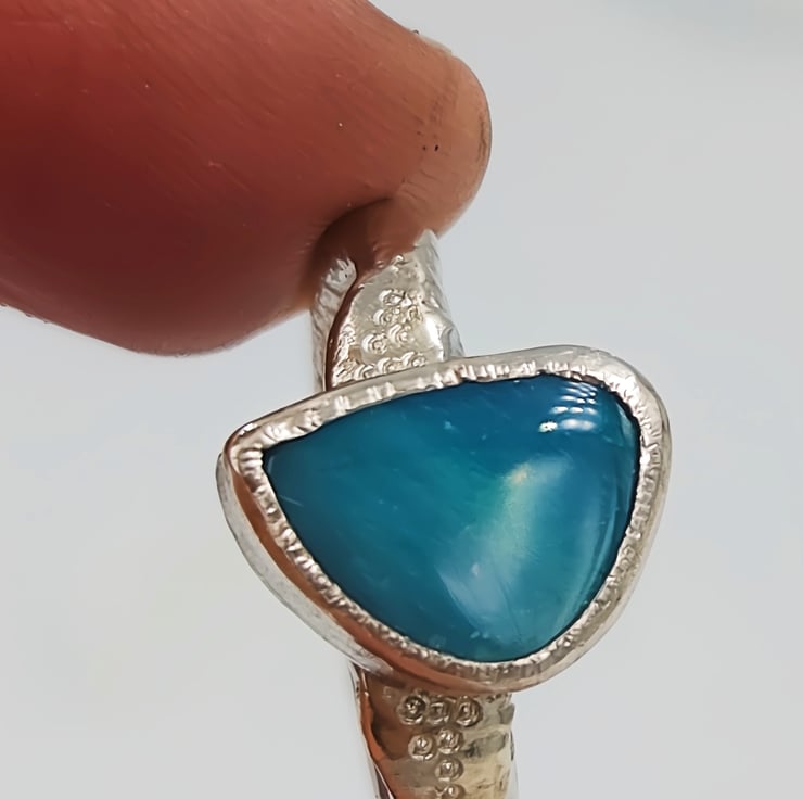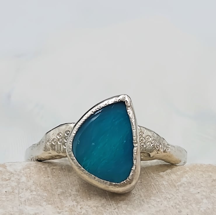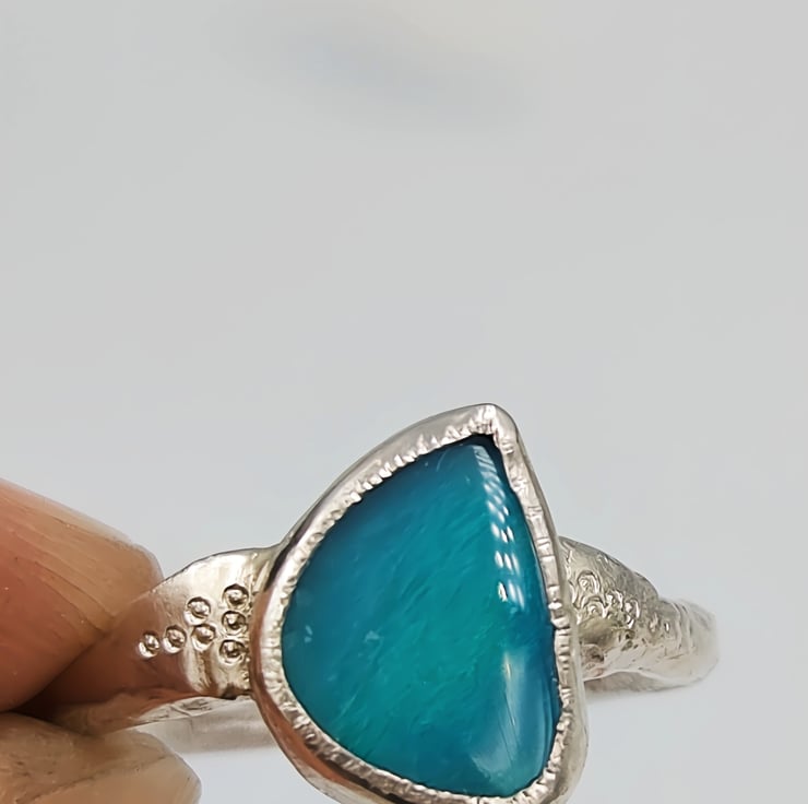 The vibrant blue-green opal shimmers with shifting tones reminiscent of ocean water-alive with depth and subtle movement. Set in solid sterling silver, the organically textured band and hand-formed setting give this ring a raw, earthy character that stands out from mass-produced pieces.
