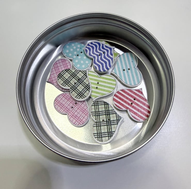 Acrylic painted wooden heart buttons with assorted colours and designs. With two holes for attachments.