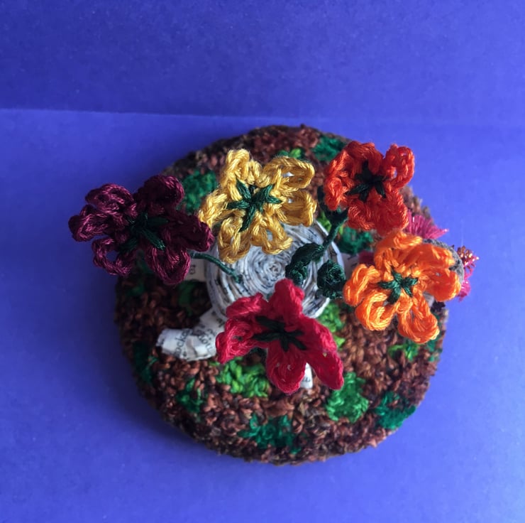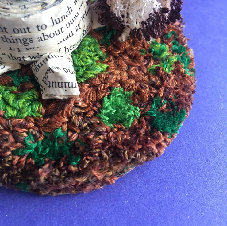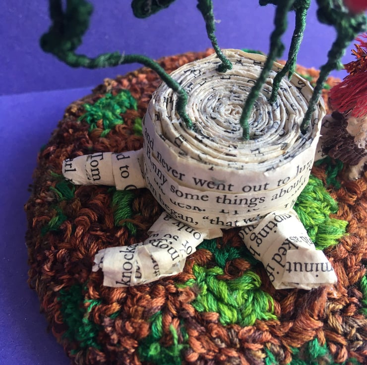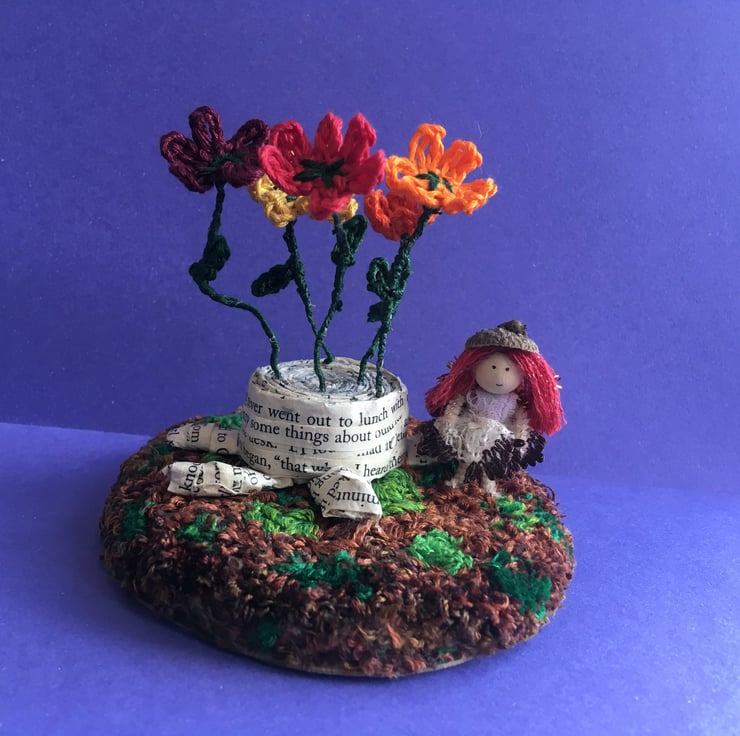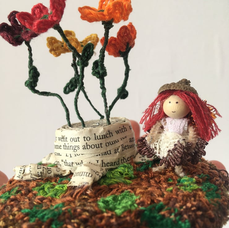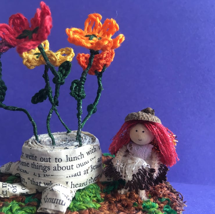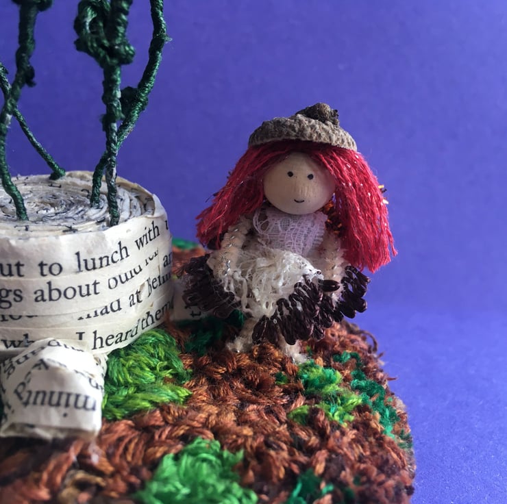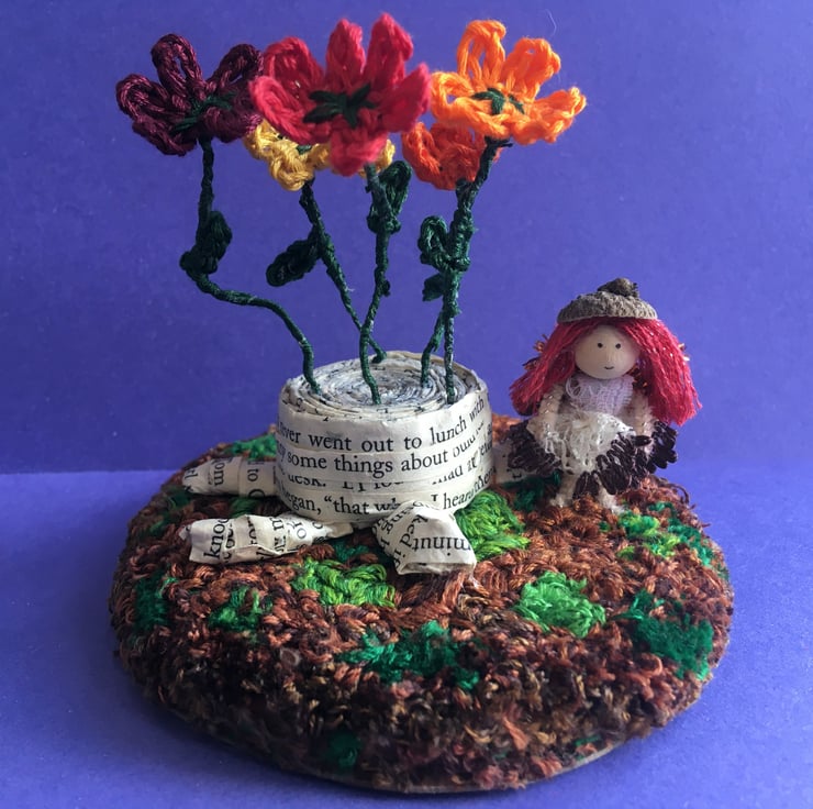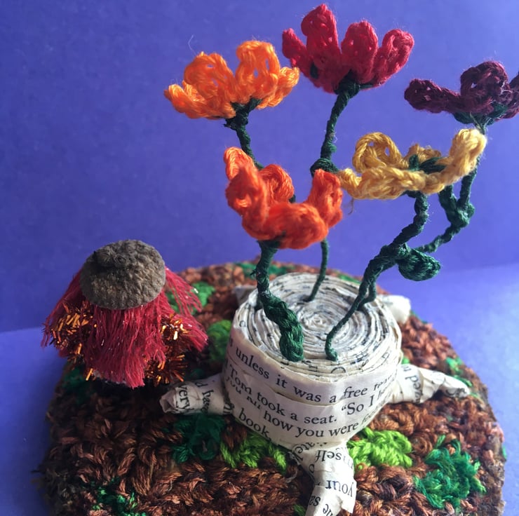 This little scene shows a tiny fairy with an acorn hat. She is stood on a embroidery thread punch needle base, beside a tree stump made from upcycled book pages. There are crochet flowers growing out of the tree stump.