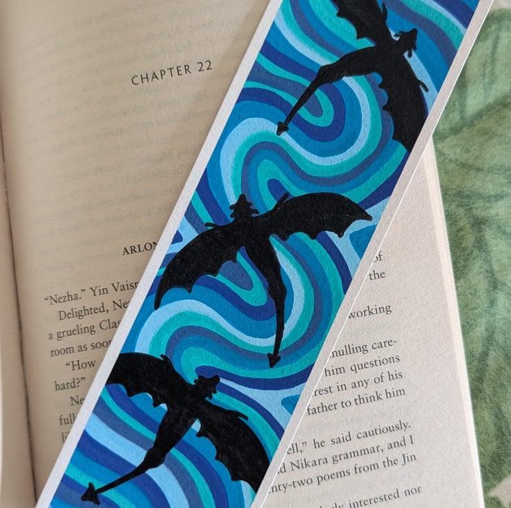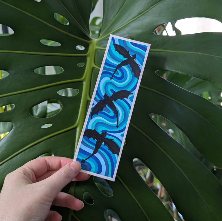 Handmade swirly bookmark in a blue colour palette, with three flying dragons silhouette. Each bookmark is a unique, one of a kind design.