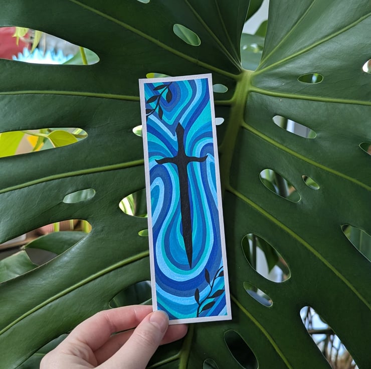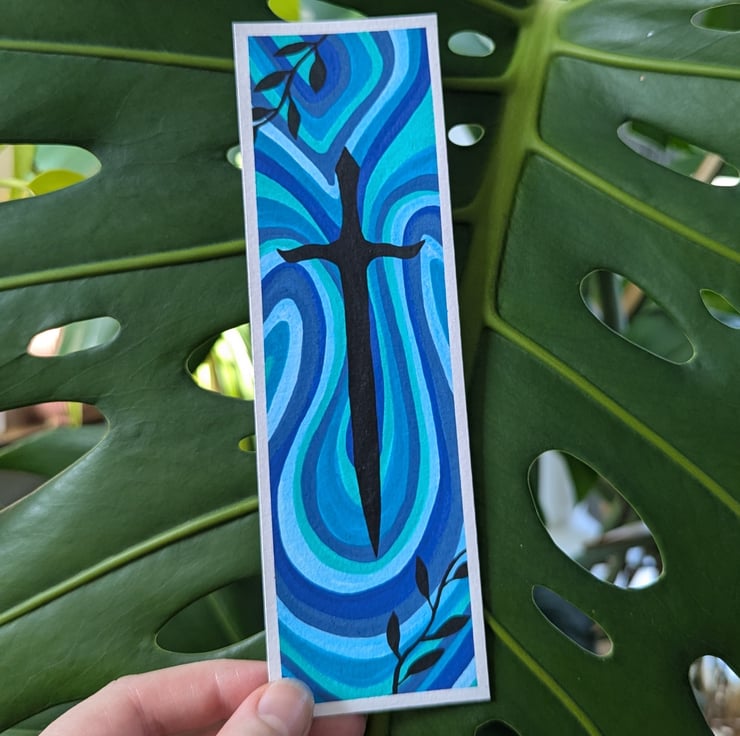 Handmade swirly bookmark in a blue colour palette, with a sword and leaves silhouette. Each bookmark is a unique, one of a kind design.