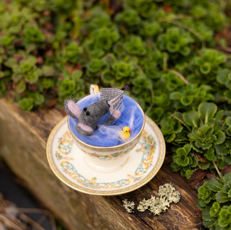 Tucked inside a delicate teacup, this tiny needle-felted mouse enjoys a moment of quiet luxury. Surrounded by soft, frothy bubbles, it pauses from its busy day to soak, rest, and simply be. Every detail is carefully handcrafted, from the gentle curve of the cup to the mouse's peaceful expression, inviting you into a world where even the smallest creatures indulge in a little comfort.
