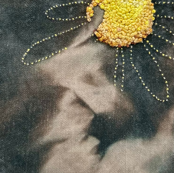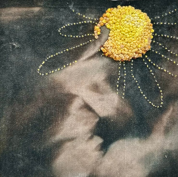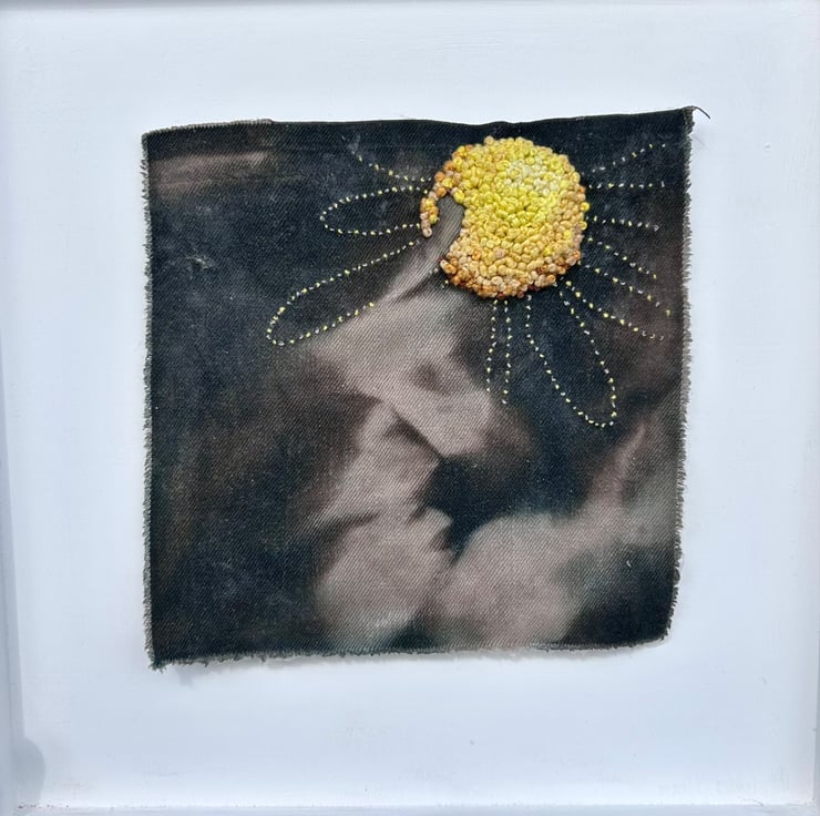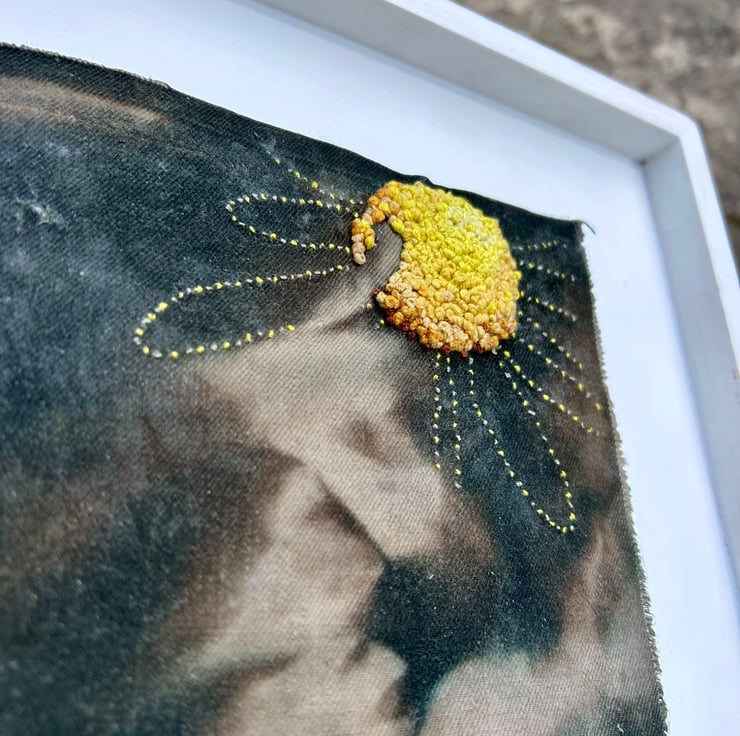 When I retrieved the cyanotype, I washed and bleached it in an ash bath. Then I toned it with leftover green tea. Finally I stitched on the Ragwort with vintage threads and mounted into an unglazed frame.