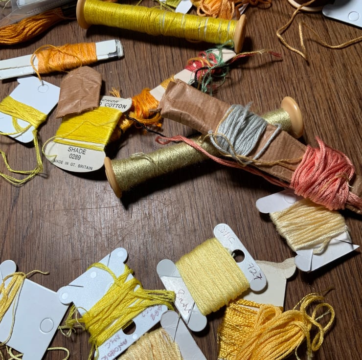 Media: scrap fabric painted with cyanotype dyes, bleached with ash and toned with used green tea, stitched with vintage threads.