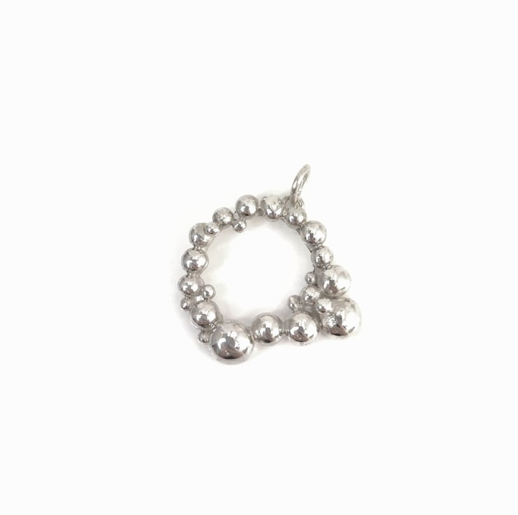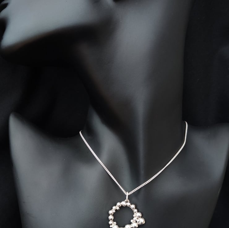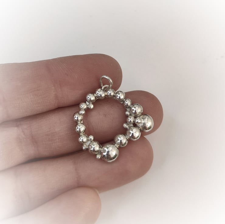 Round pendant featuring solid upcycled, highly polished silver pebbles. Unique and eye catching piece.
