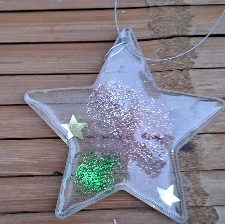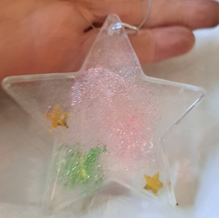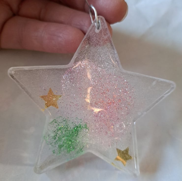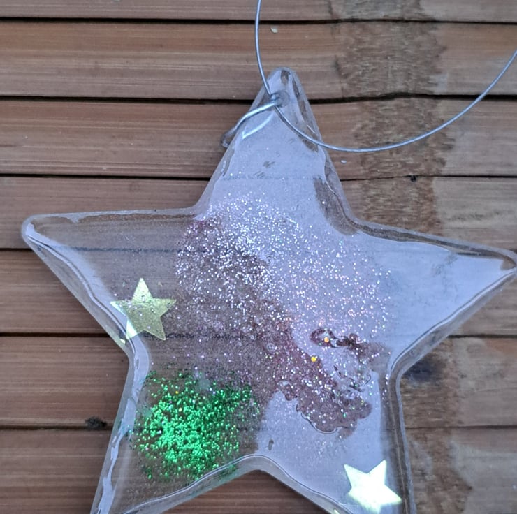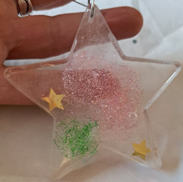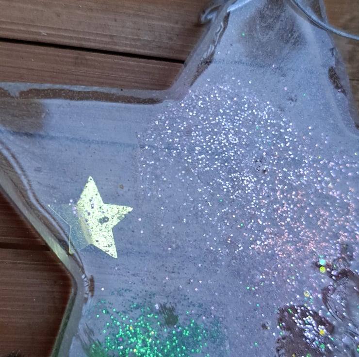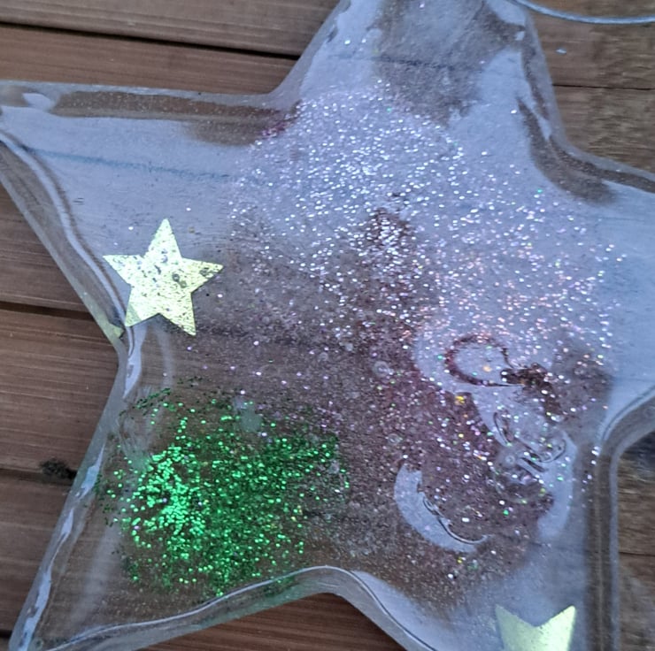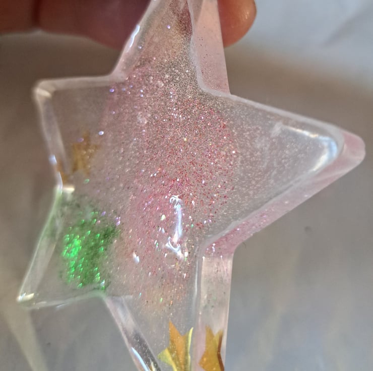 Handmade resin star, each star is made by adding resin to a mould. Then decoration can be added.