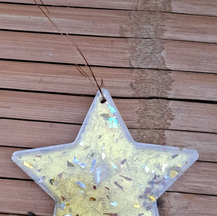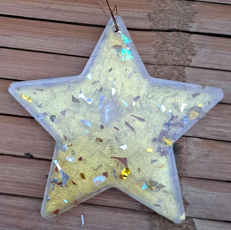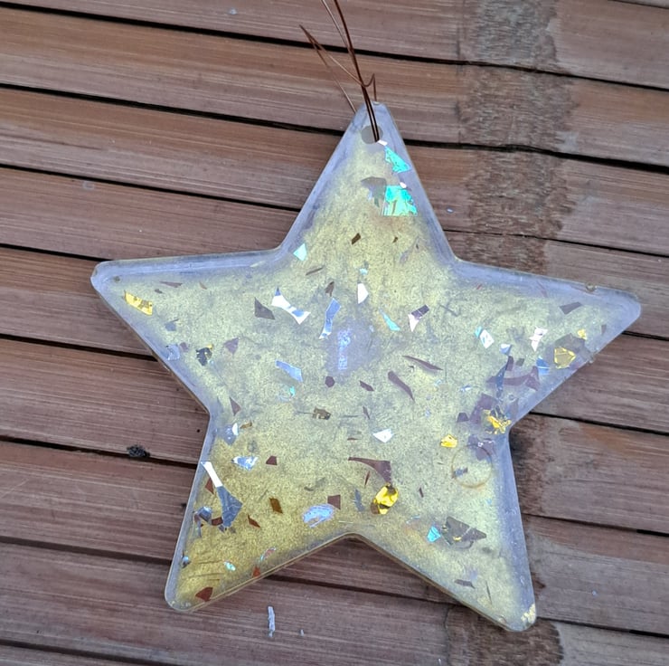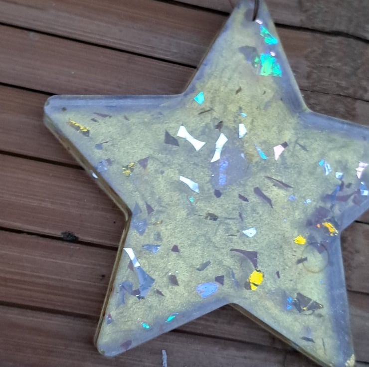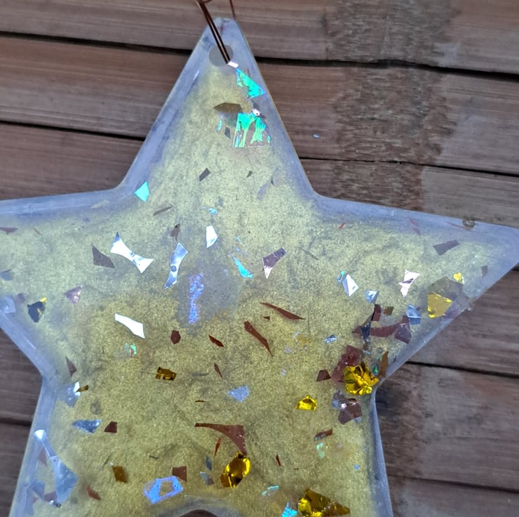 Handmade resin star, each star is made by adding resin to a mould. Then decoration can be added.