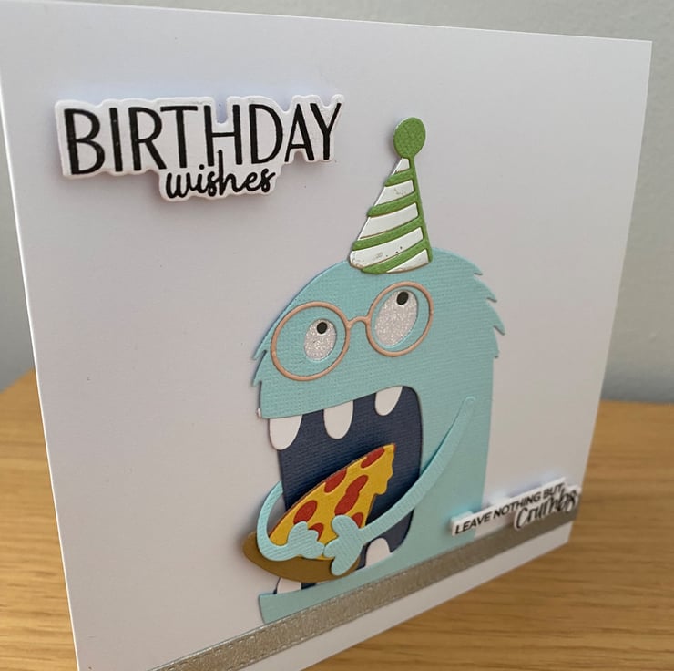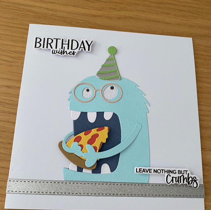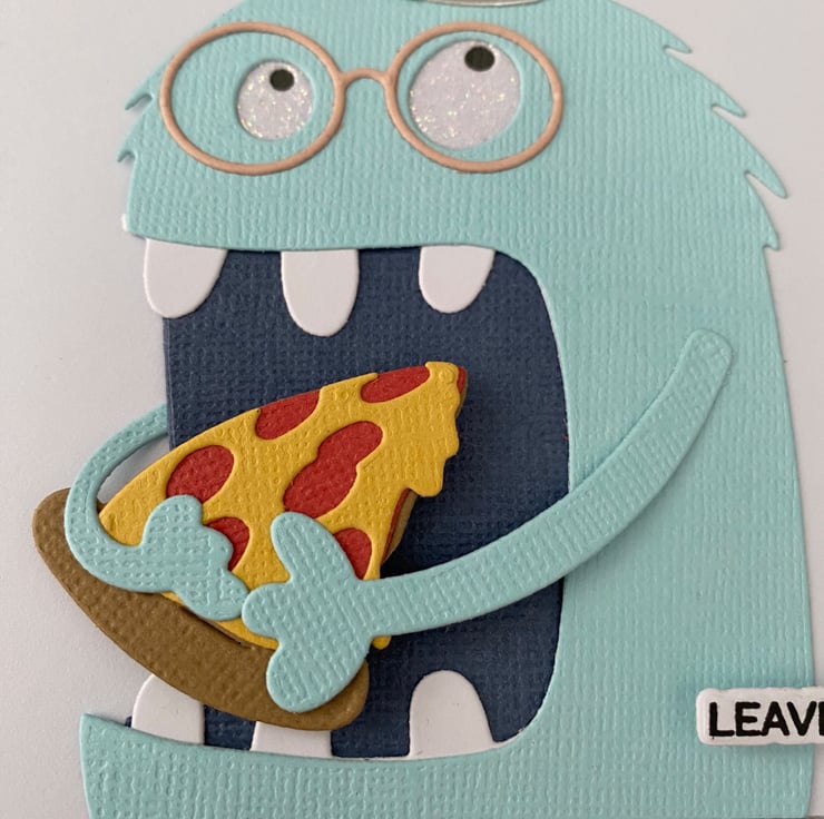 Serve up a slice of birthday fun with this quirky handmade card featuring a bright blue monster who's very serious about pizza. With big sparkly eyes, a striped party hat, and a giant slice of cheesy goodness in hand, this character brings instant joy and a dash of cheeky humour.