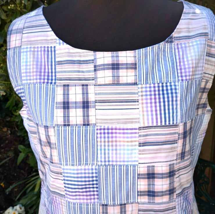 Easy to wear cotton dress. A perfect dress for a summer holiday. Crafted from four rescued mens shirts. The bodice is made of small patches of the different fabrics and lined.