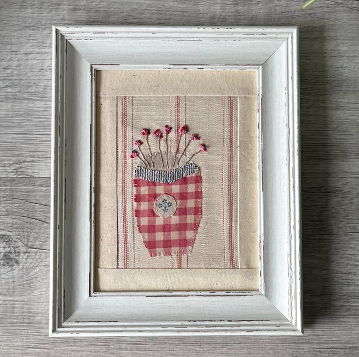 The picture features a pot with embroidered stems and little pink blooms. Hand embroidery and appliqué adds to the vintage, rustic feel. I love to tea dye fabrics to use in work like this as they soften and "knock back" what might be otherwise stark fabrics. It would be a lovely addition to any room of the house.
