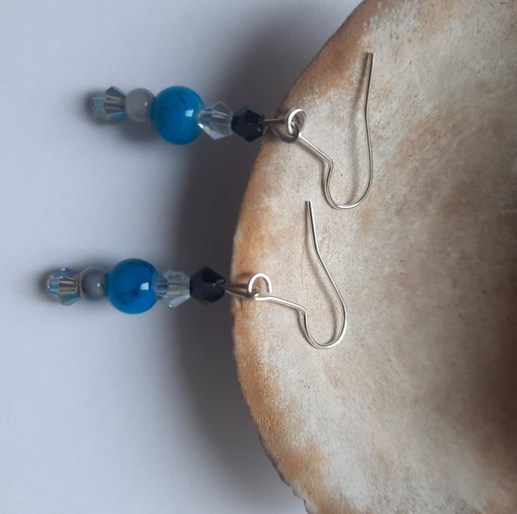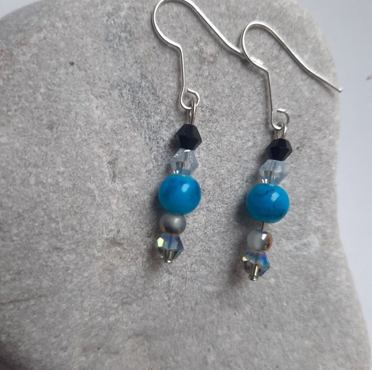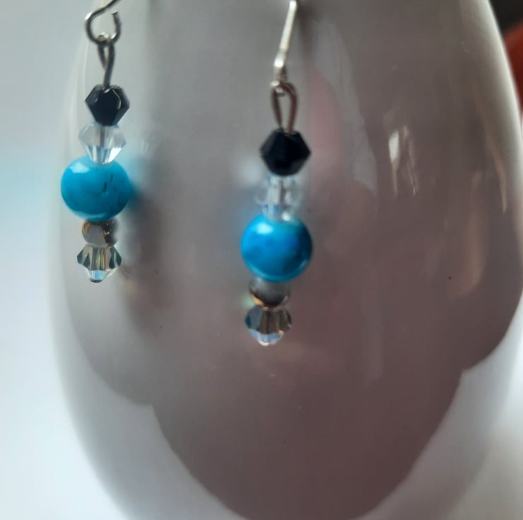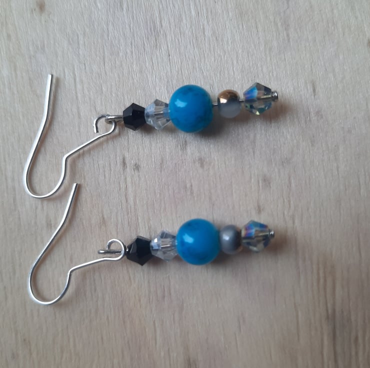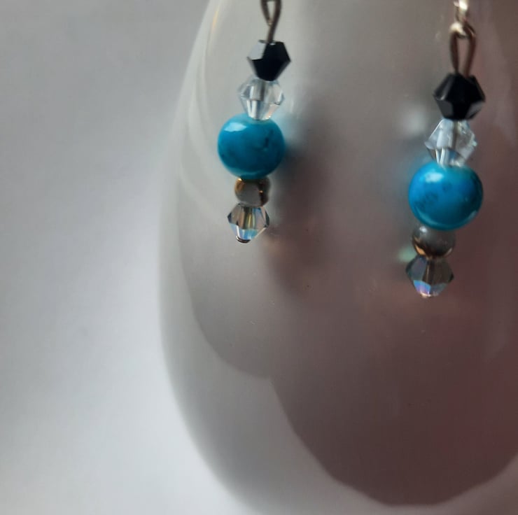 This is a pair of hand crafted dangle earrings featuring a sequence of decorative beads including turquoise - coloured round and faceted glass crystal beads on silver-toned wires. Silver-toned fishhook ear wires. Faceted bicone crystal beads iridescent faceted crystal drops.The central blue beads is dyed now like Turquoise.The bottom crystal features an Aurora Borelis coating for extra shimmer. This is a beautiful handmade gift.