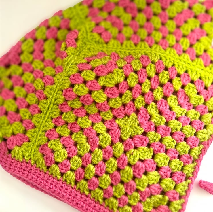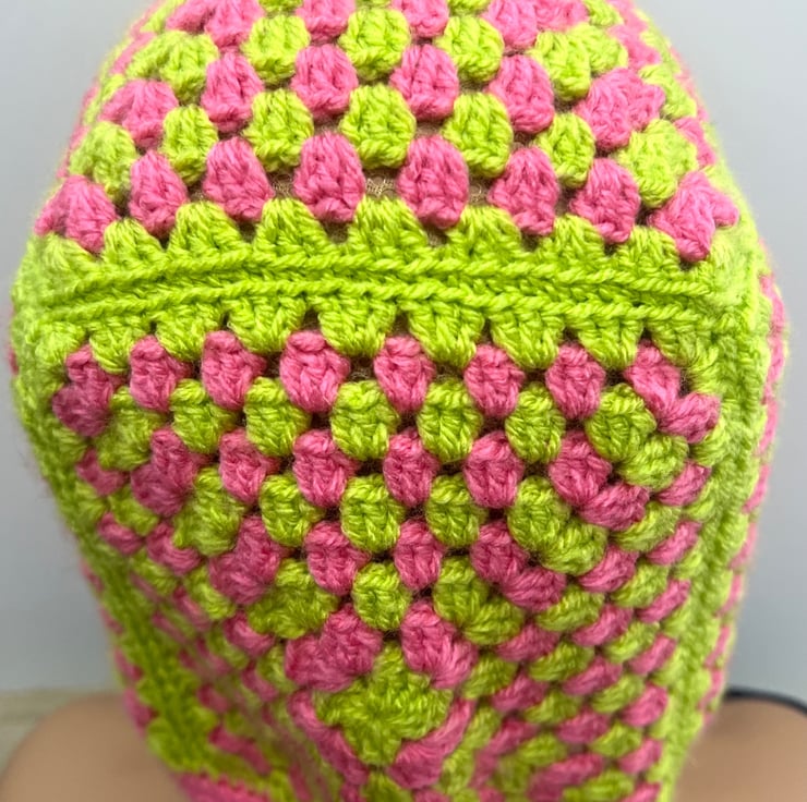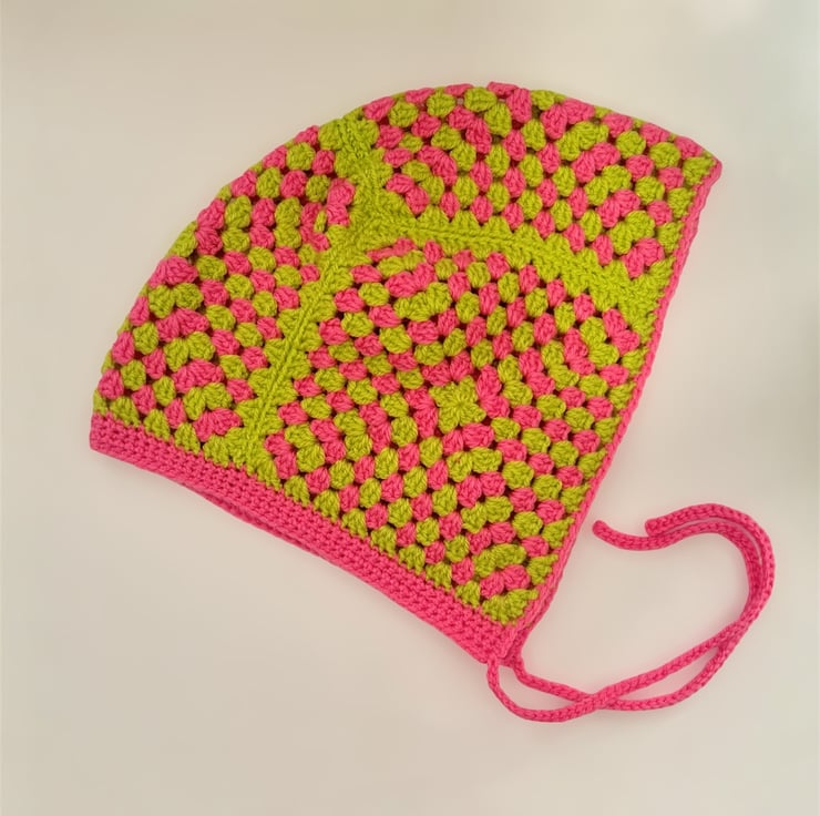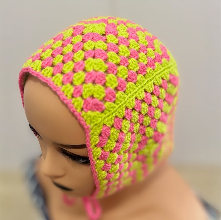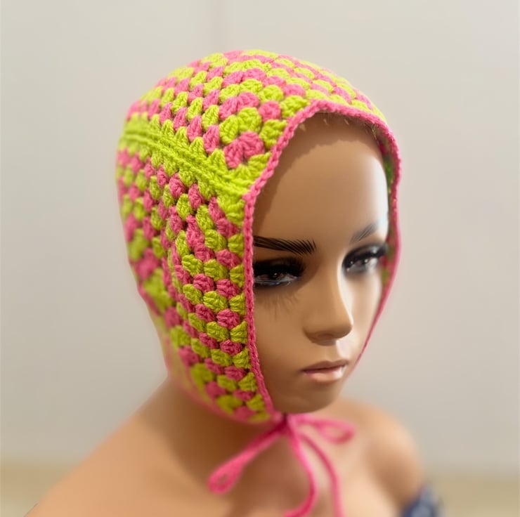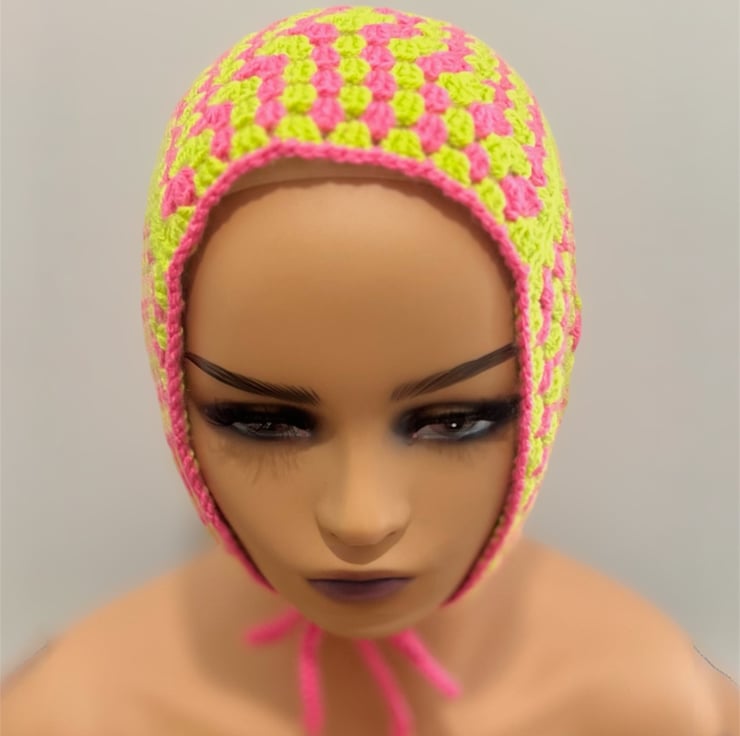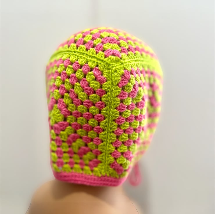 Handmade Granny Square Crochet Bonnet Neon Pink and Green Retro Style Balaclava