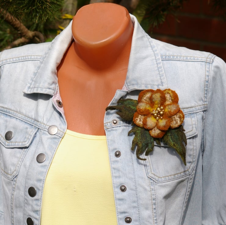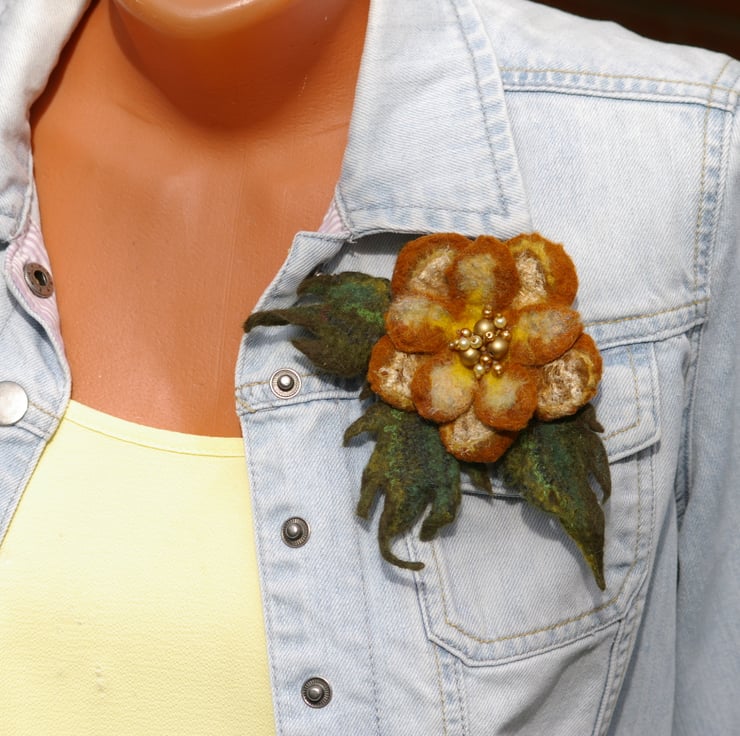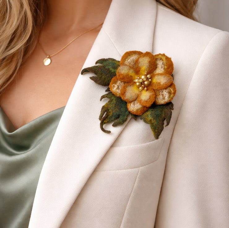 Add a touch of natural beauty to your outfit with this handcrafted felt wool flower brooch. Carefully made by hand, this unique accessory showcases the artistry of traditional felting techniques combined with a modern and elegant design.