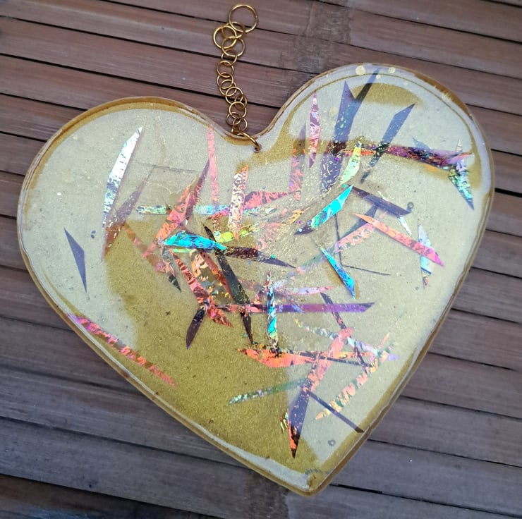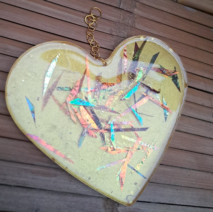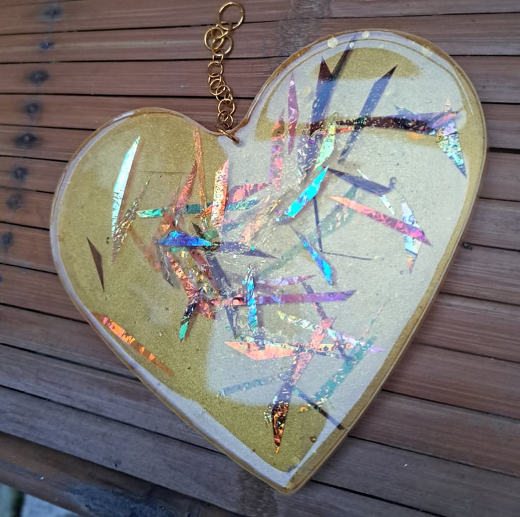 A resin heart with gold pigment and strips of dichroic. The light bounces of the dichroic strips. Hanging from a gold chain.