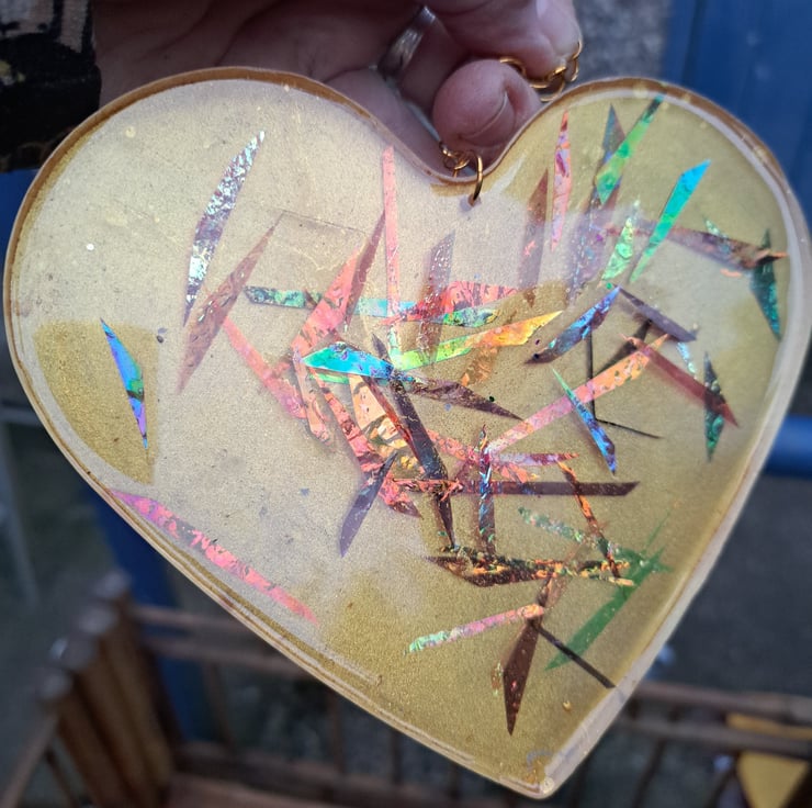 Handmade resin heart, each heart is made by adding resin to a mould. Then decoration can be added.