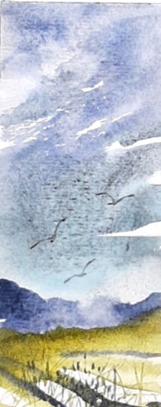 Soft greens, lilacs and blues evoke misty mountains. Just letting the granulating paint do its work.