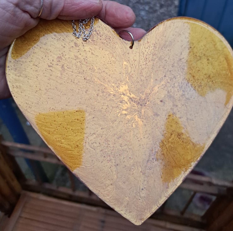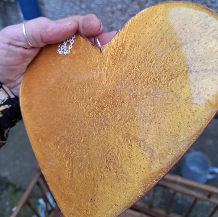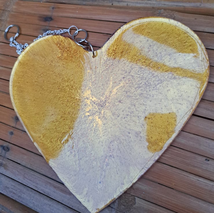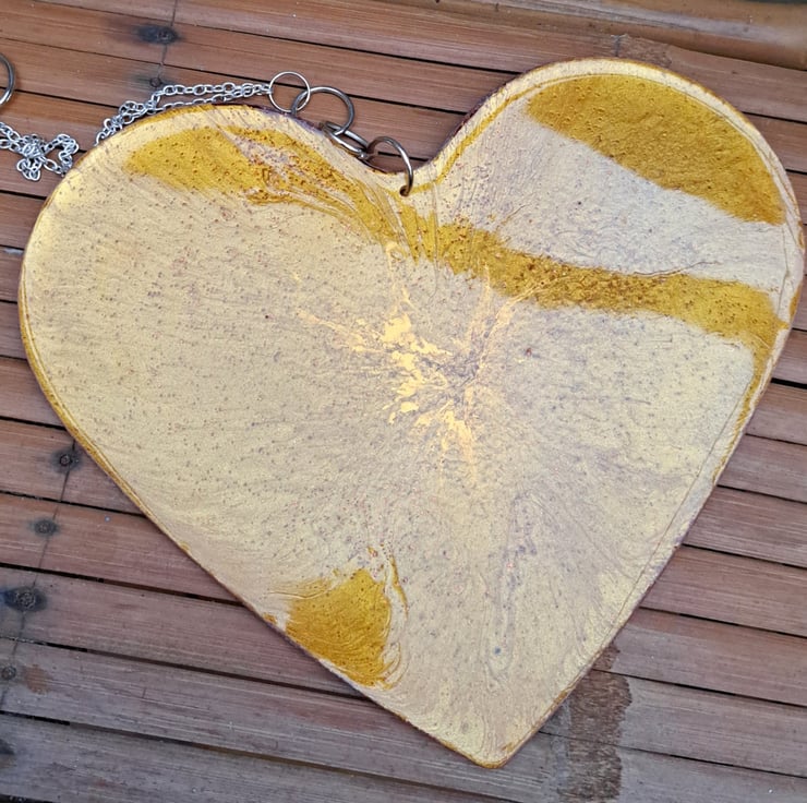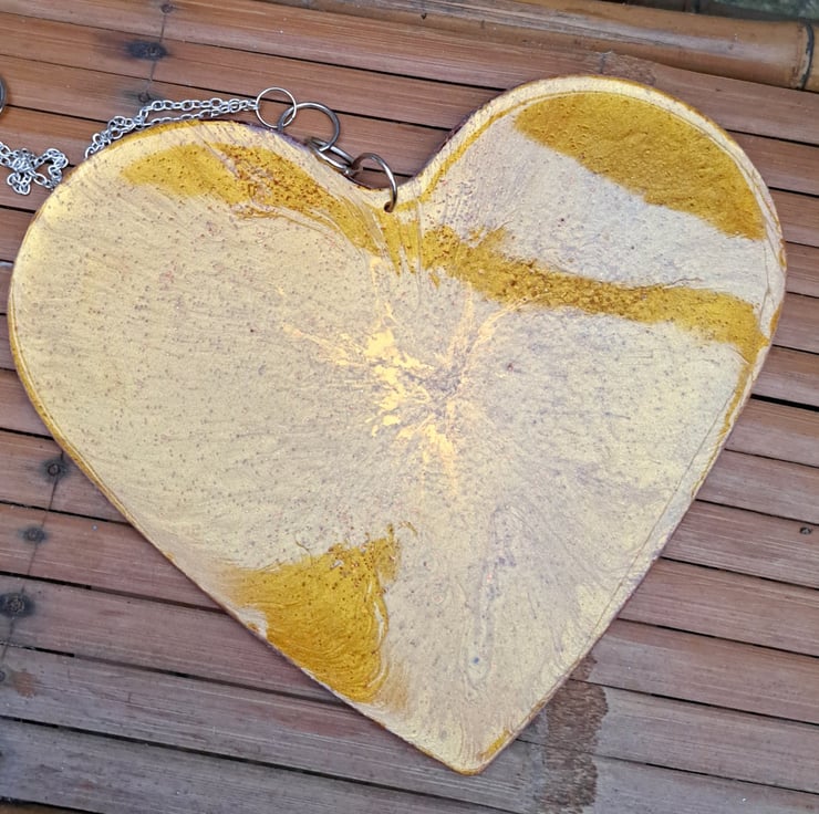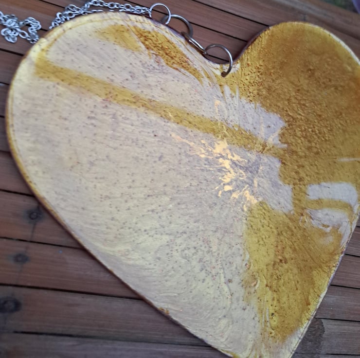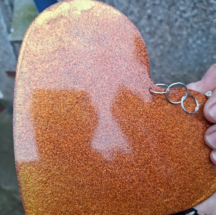 An resin heart with gold pigment and glitter added. Orange glitter has been added to the back. Hanging from a silver plated chain.