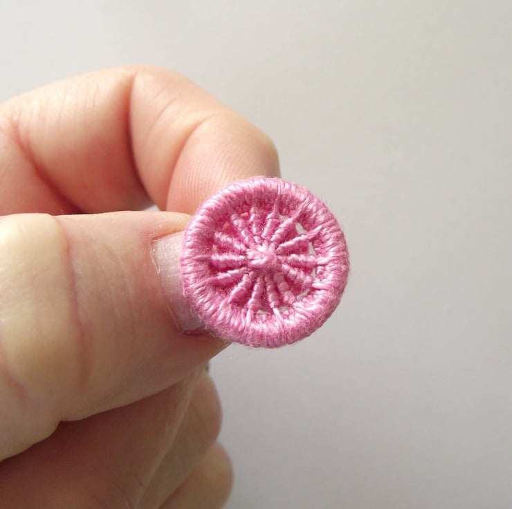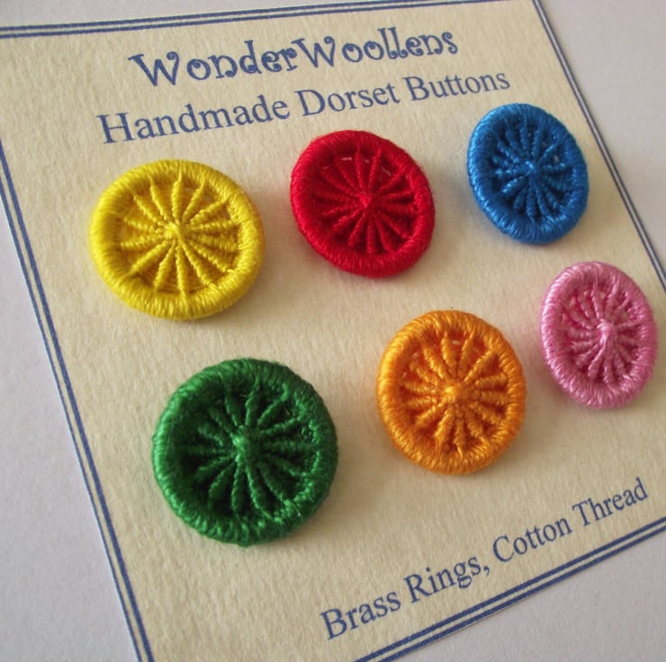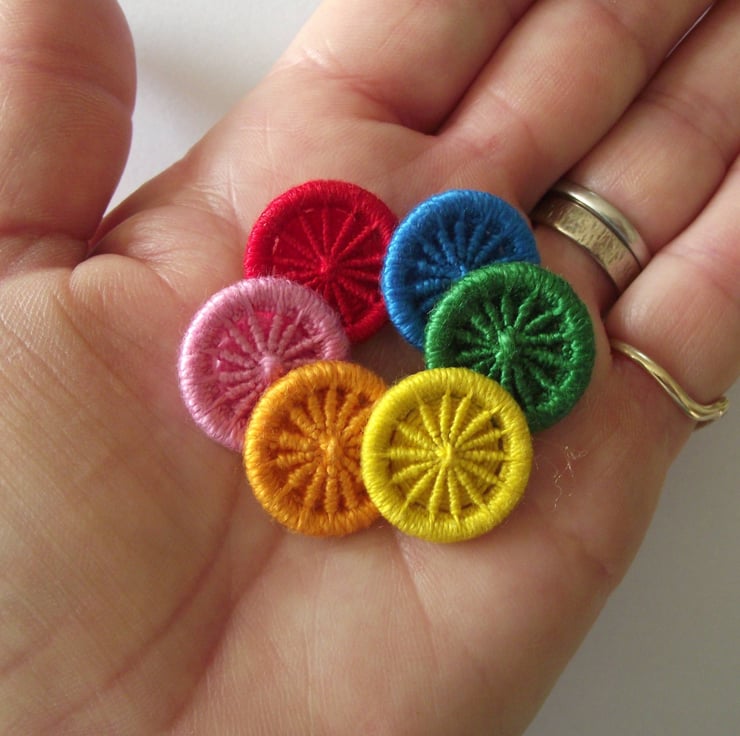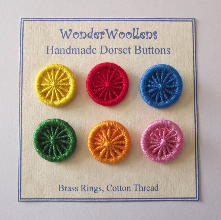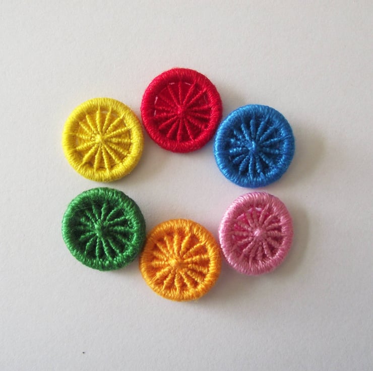 This listing is for six 2cm Dorset crosswheel buttons with 14 spokes. I made these by using various techniques of working cotton thread in different bright colours, around metal rings. Yellow, orange, red, blue, green, pink. I have incorporated integral thread shanks on the back for easy attachment to your project or clothing.