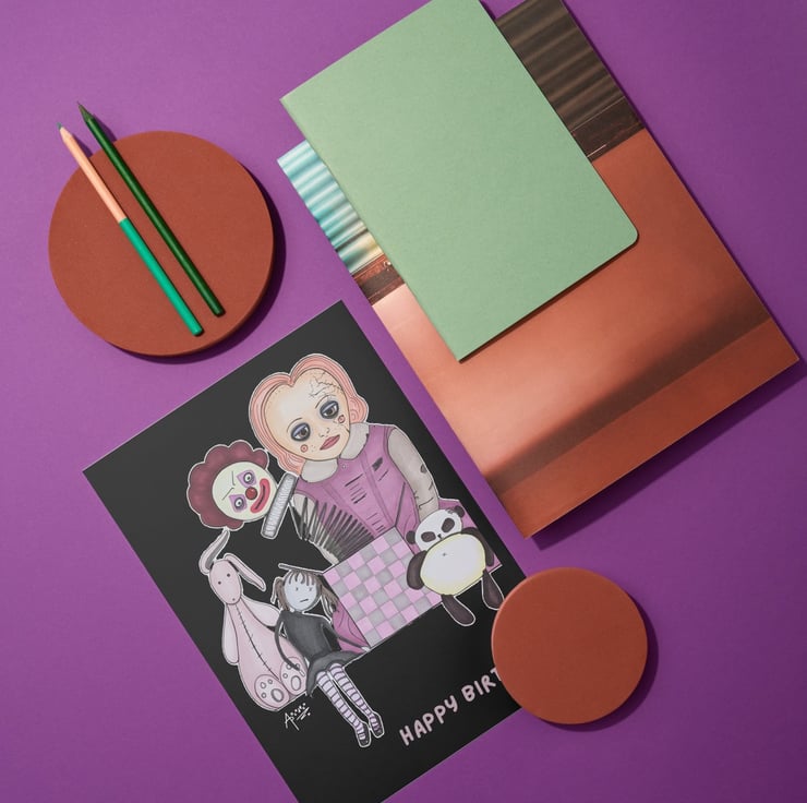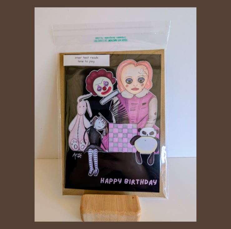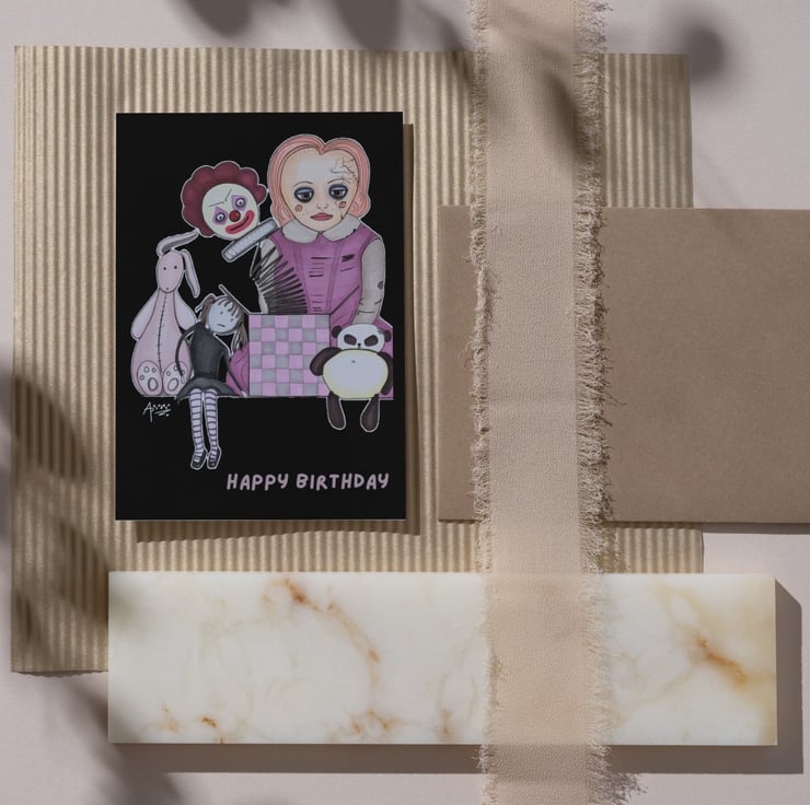 Looking for an alternative creepy birthday card? The collection of spooky toys on this card could be just the thing you're looking for! Featuring an original ink artwork, this birthday card is printed on high-quality smooth card and has the message 'happy birthday' on the outside, 'time to play' on the inside. Each card is sent in a biodegradable sleeve and comes with a brown kraft paper envelope.