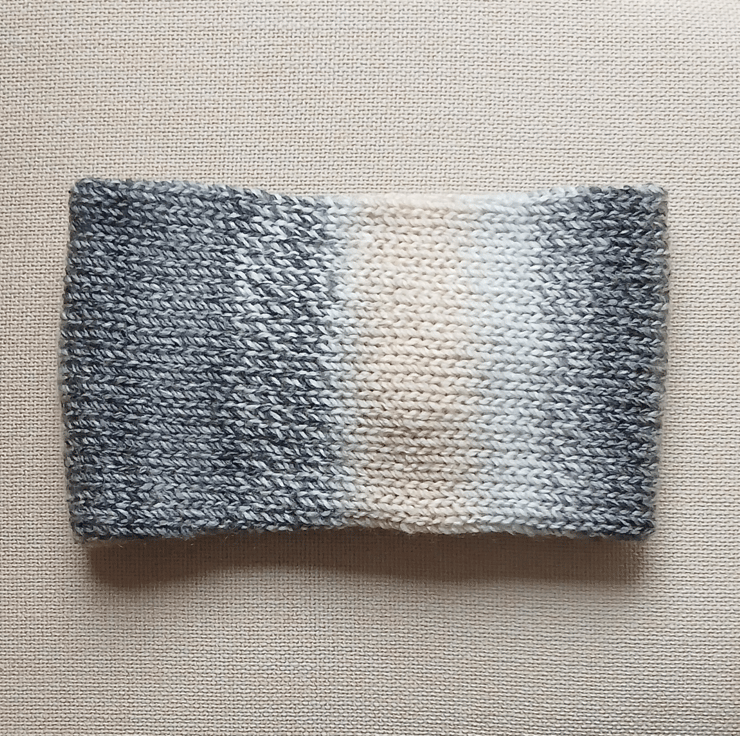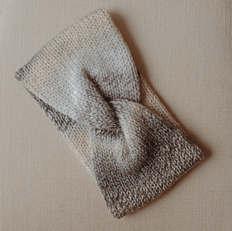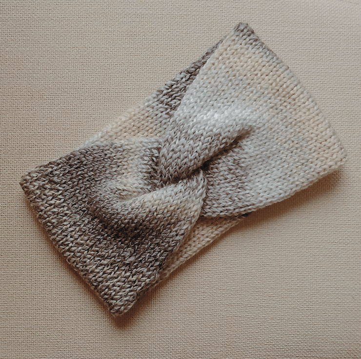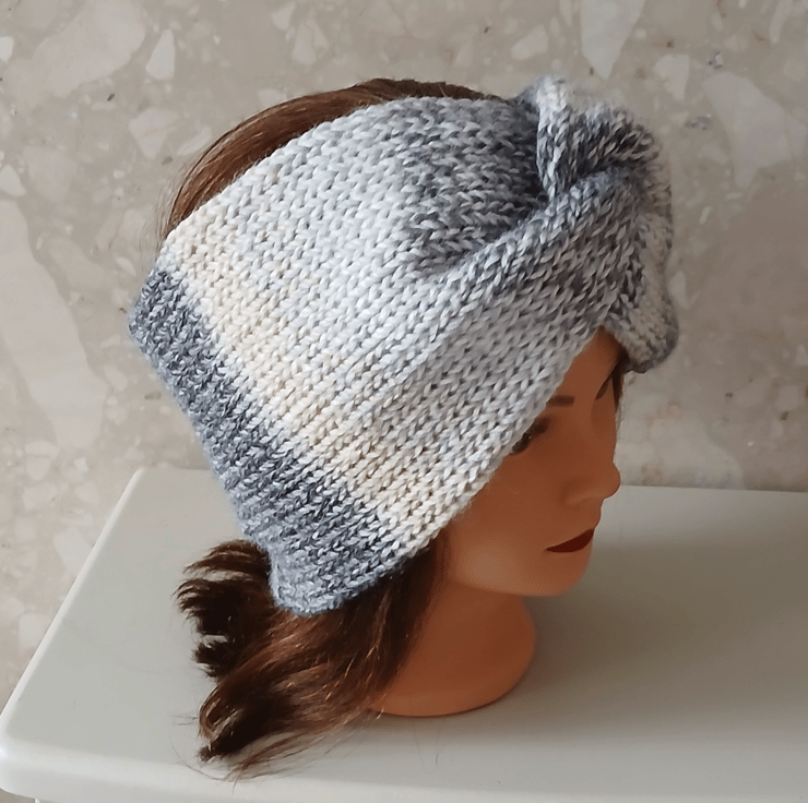 Composition: The headband is knitted in the round and then joined into a circle with a twist at the front.