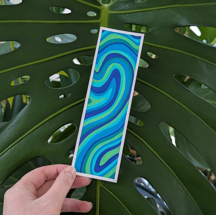 Handmade swirly bookmark in a bright green and blue colour palette. Each bookmark is a unique, one of a kind design.