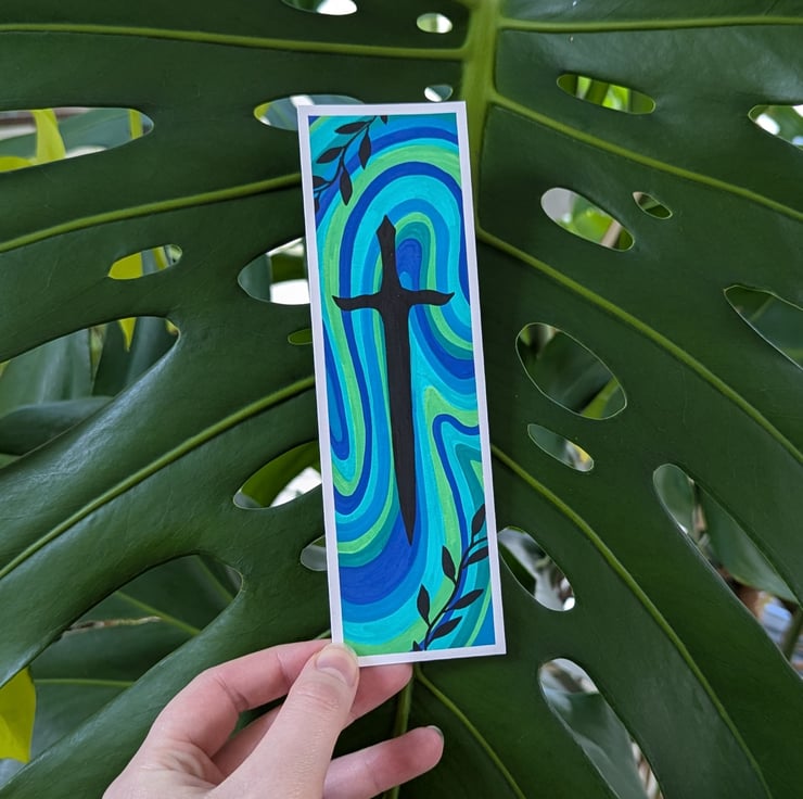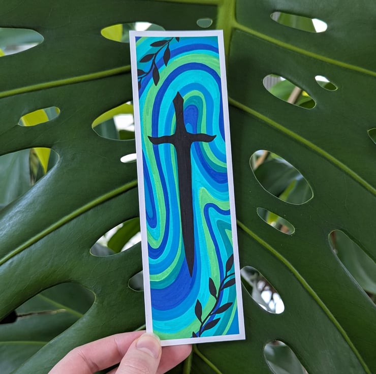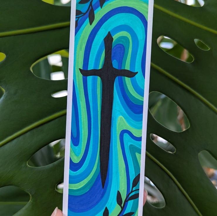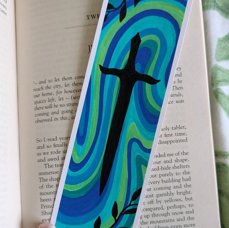 Handmade swirly bookmark in a green and blue colour palette, with a sword and leaves silhouette. Each bookmark is a unique, one of a kind design.