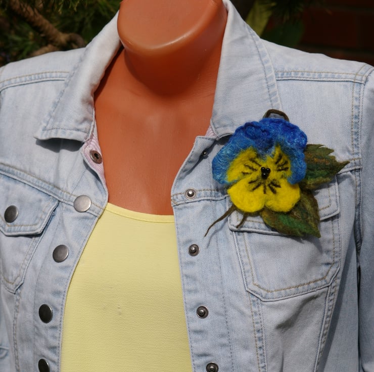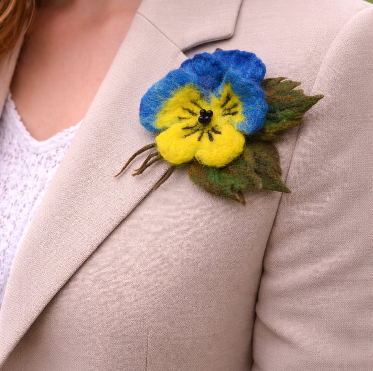 Handmade felted wool brooch in the shape of a vibrant flower. This unique accessory is created using the wet felting technique and features a striking combination of deep blue and bright yellow tones with natural green leaves. The center is accented with decorative details, adding texture and character to the piece.