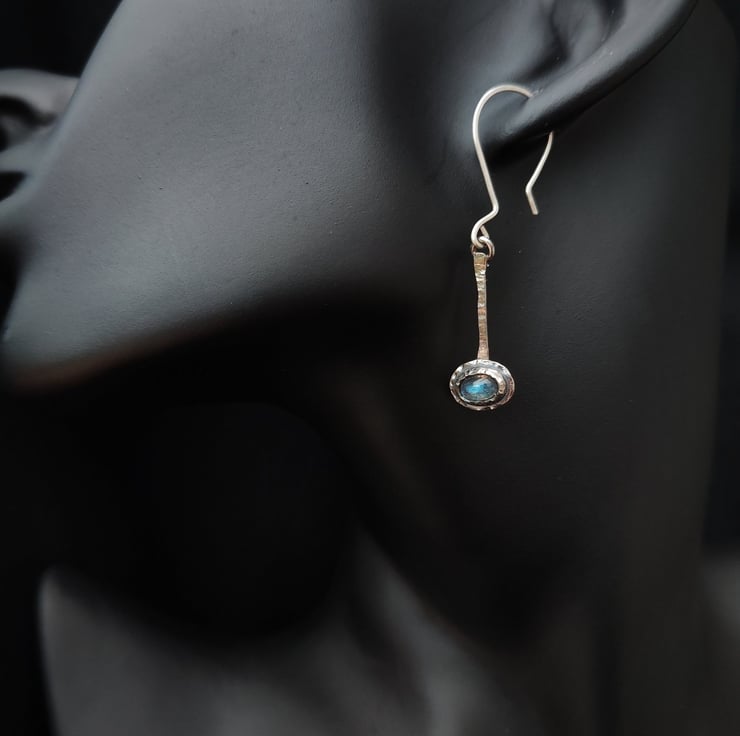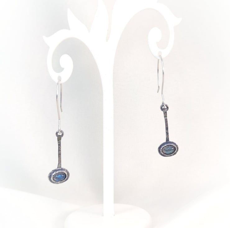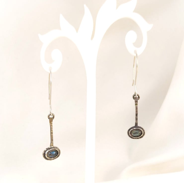 Patinated sliver earrings featuring oval labradorites in oval setting. Stone have a lovely labradorescence/irridescence that is enhanced by darkened silver.