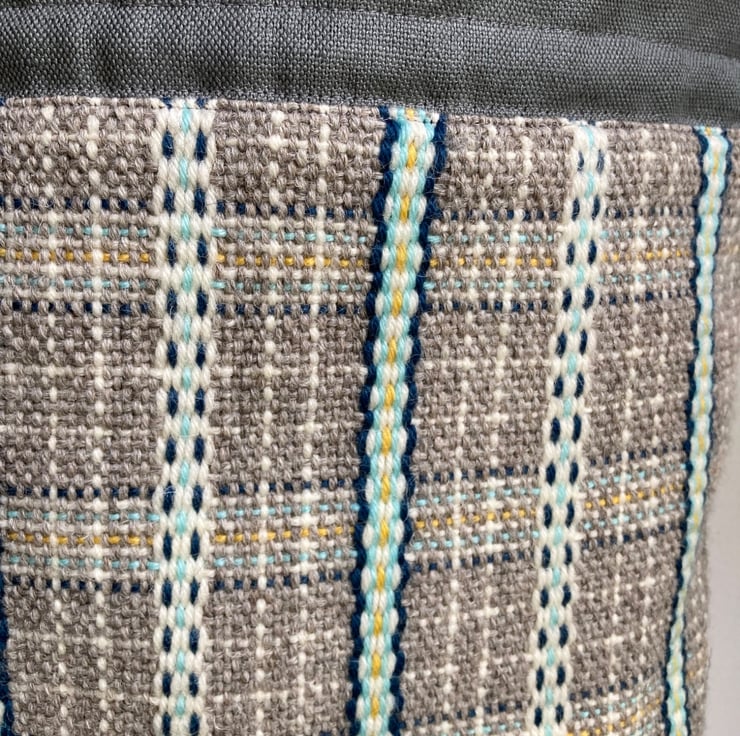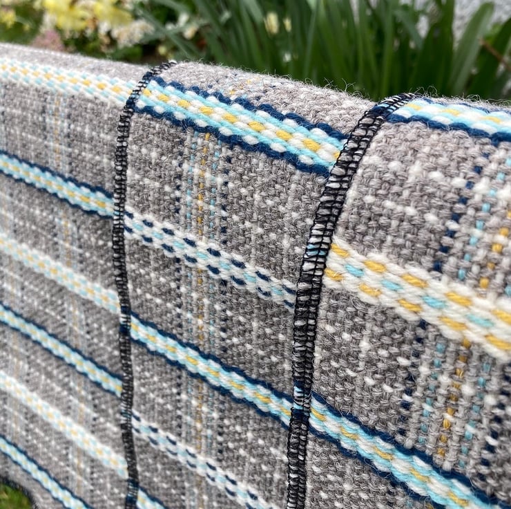 Handwoven wool fabric in shades of pastel blue, yellow and dark blue. Woven along side the natural shades of grey and ecru wool which we use as a base mix for most of our woven cloth - all British wool.
