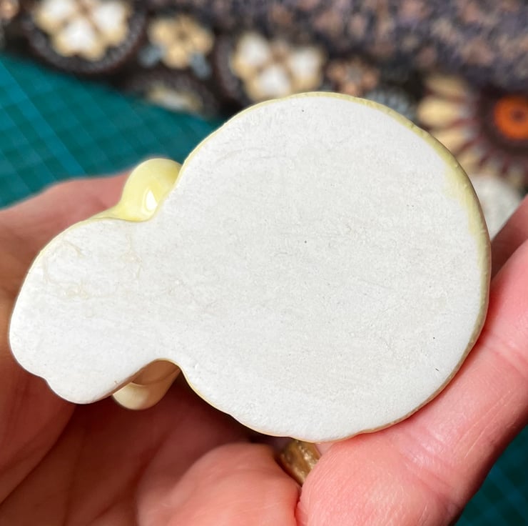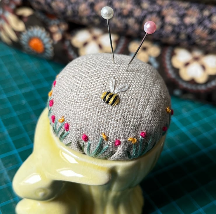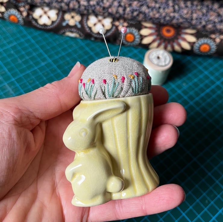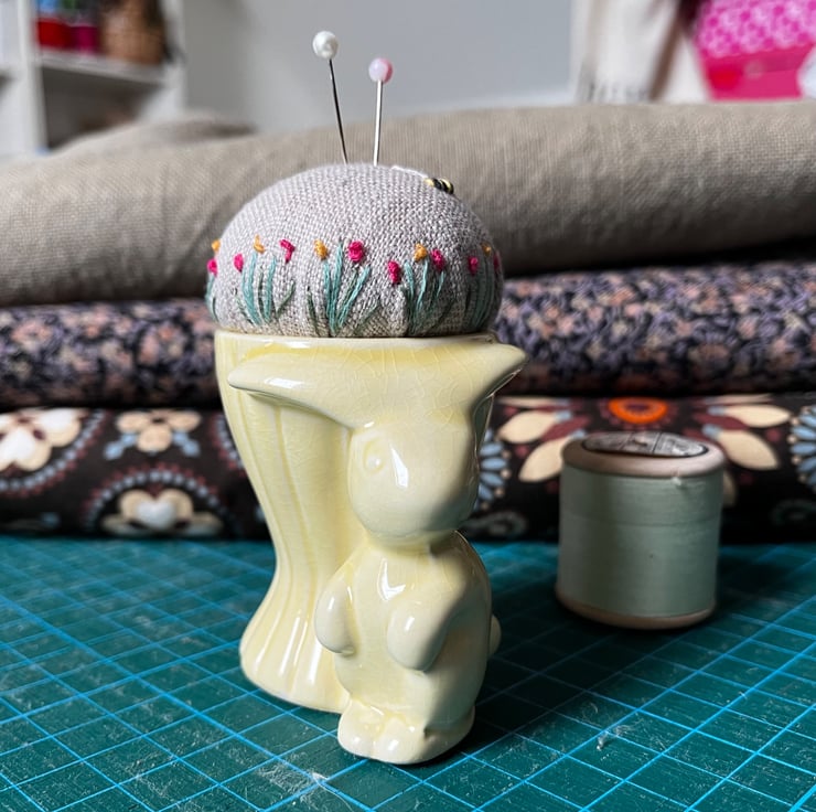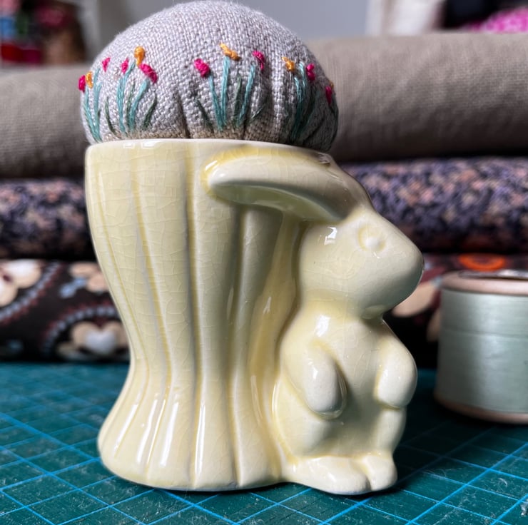 Cute little pincushion in a vintage egg cup. The rabbit egg cup holds a reclaimed linen cushion which has been embroidered with tiny flowers and a bee.