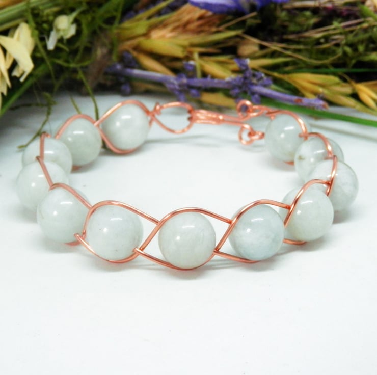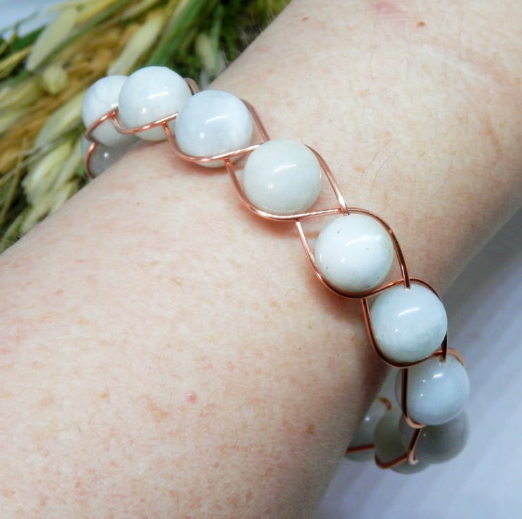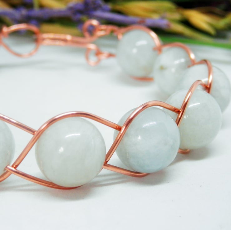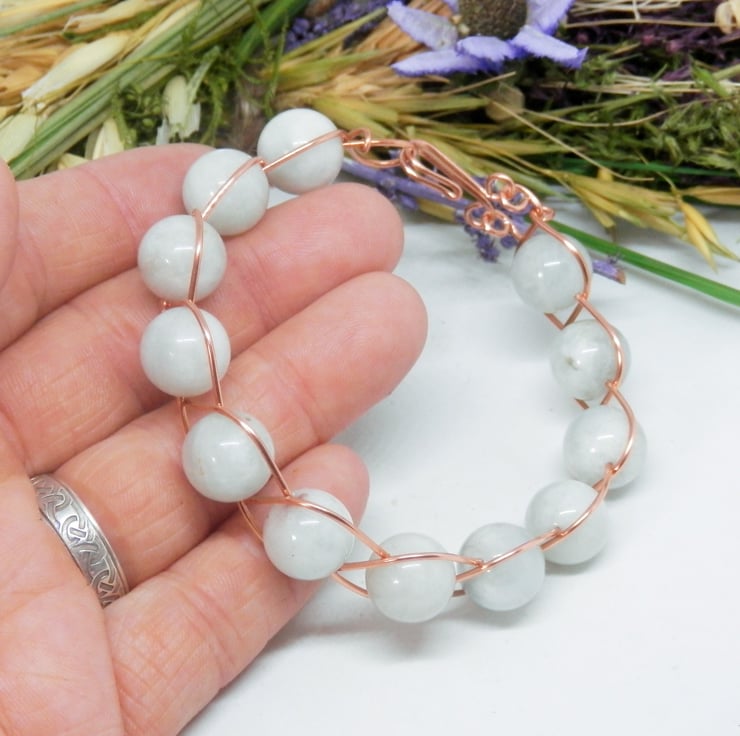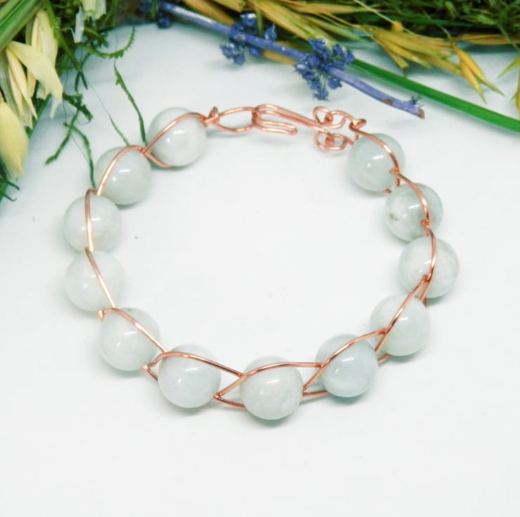Here we have a fabulous Bracelet made using copper wire that has been braided and threaded through with lovely Aquamarine Beads. Fastens with a hand made copper clasp.