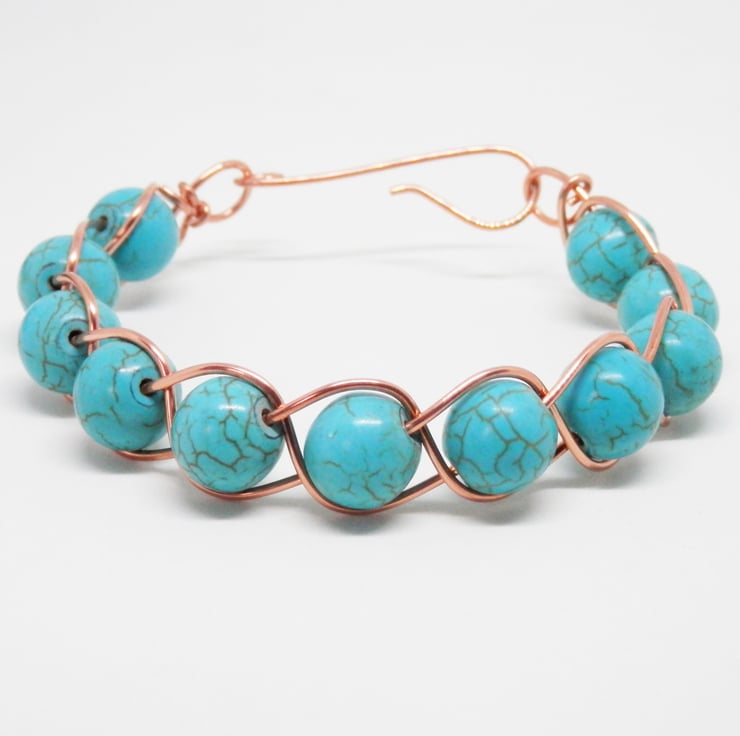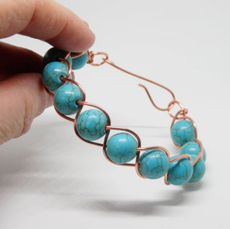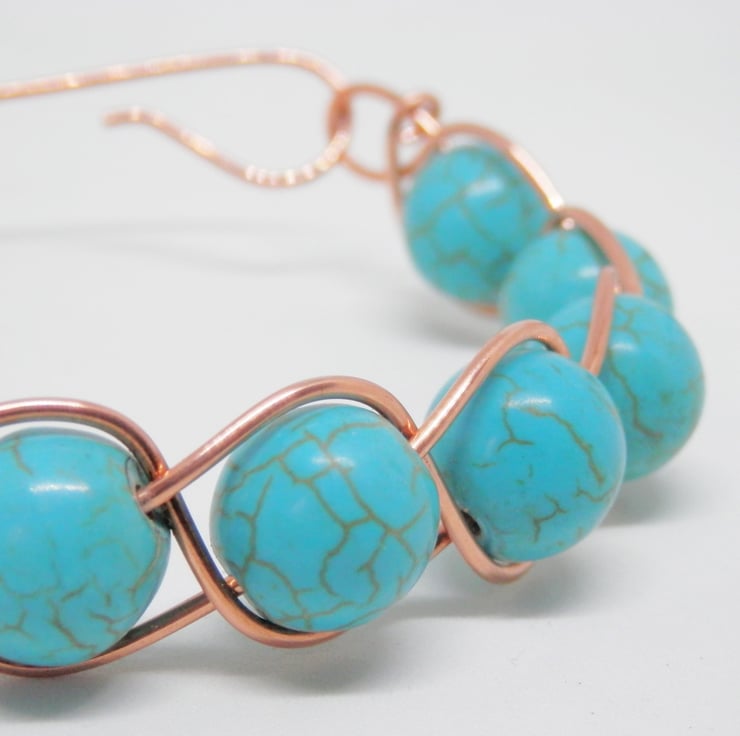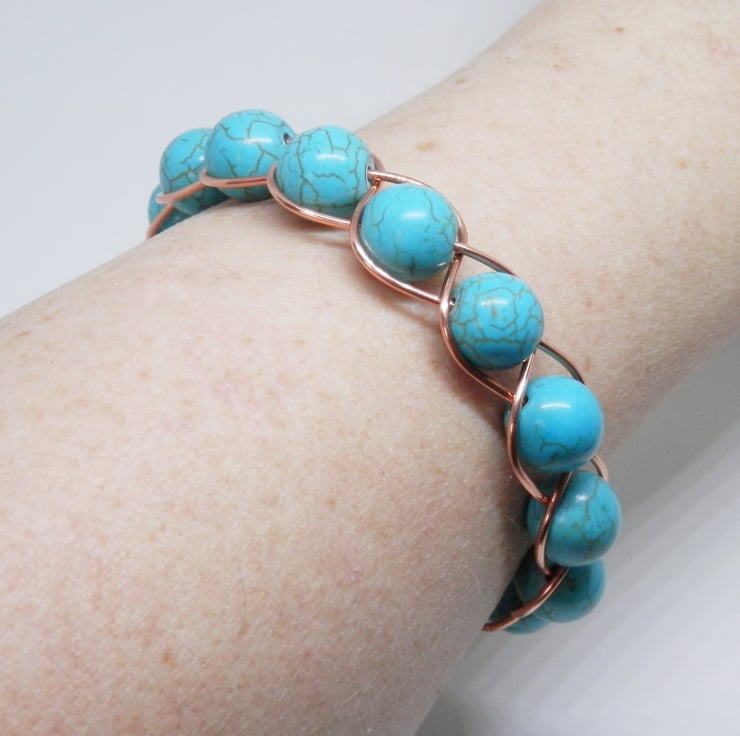 Here we have a fabulous Bracelet made using copper wire that has been braided and threaded through with beautiful synthetic Turquoise Beads. Fastens with a hand made clasp.