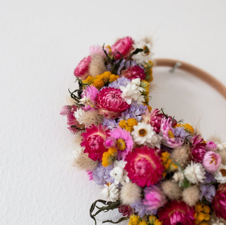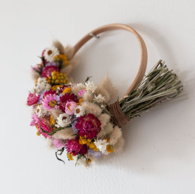 Handmade spring to summer pink, yellow and lilac dried small flower wreath