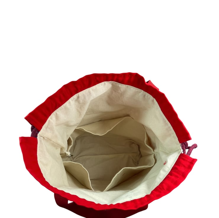 The bag is lined with natural coloured cotton fabric. Inside the whole circumference are pockets in varying widths, a total of 5, 2 being perfect for needles, the others for notions, patterns etc. There is also a lobster clasp on webbing perfect for holding stitch markers or maybe keys.