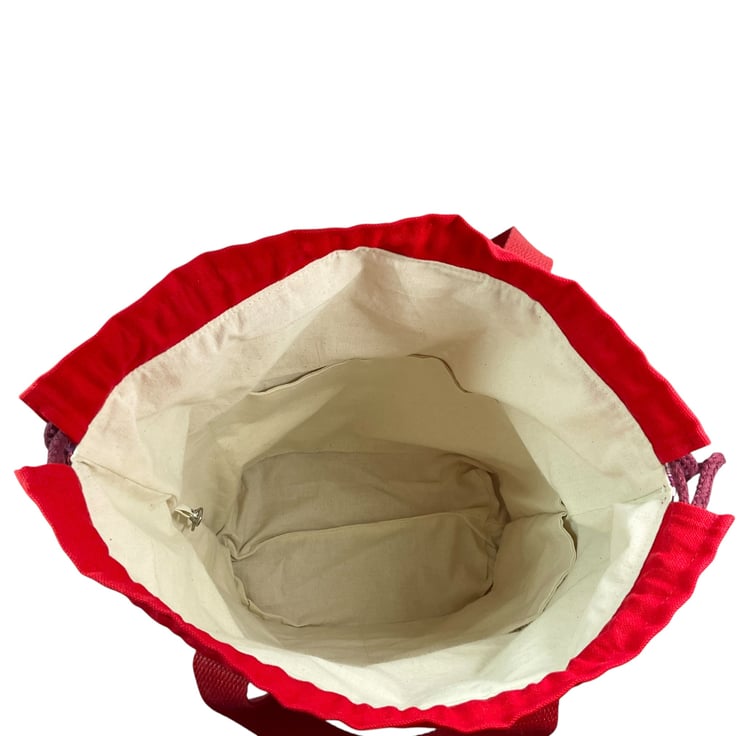 On the top are 2 strong cotton webbing handles for carrying and the it closes with 2 plaited cotton drawstrings that you pull at each end.