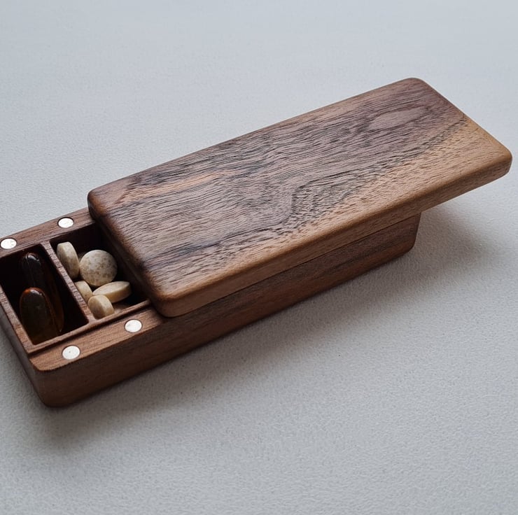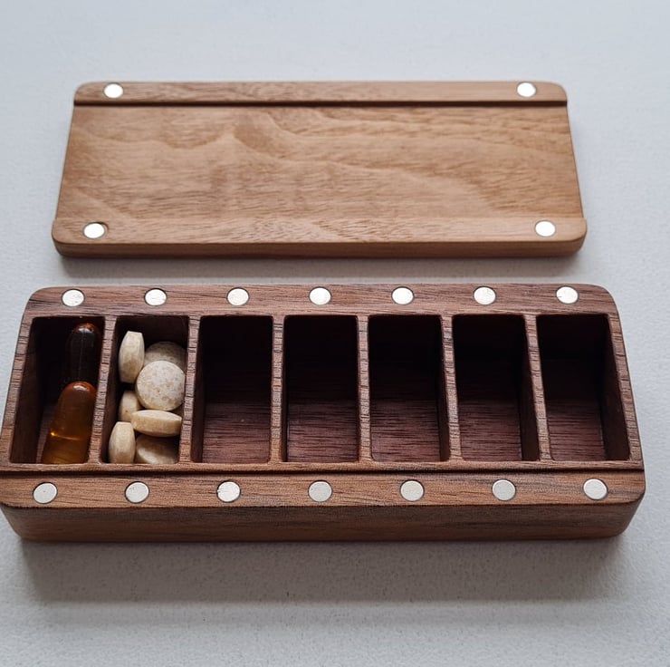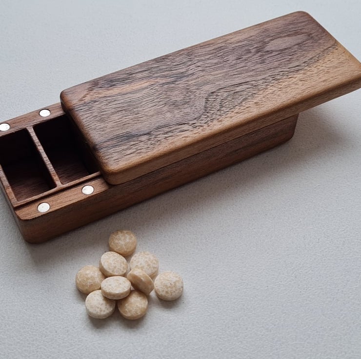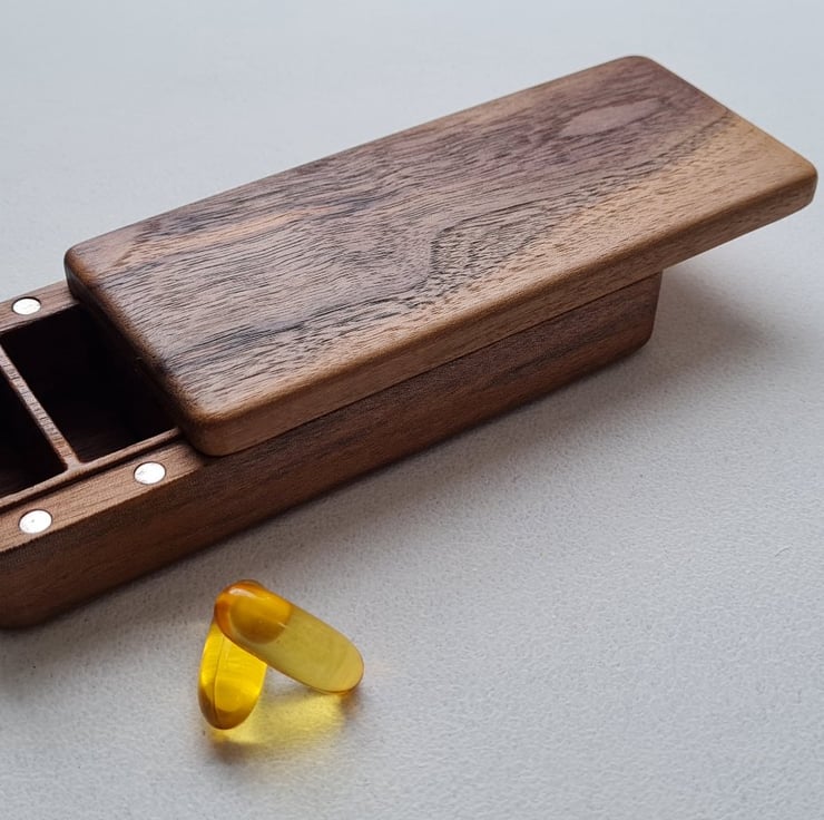 Crafted to bring both beauty and calm order to your daily routine, this medium solid Walnut wood pill box is more than just storage – it's a small ritual in itself.