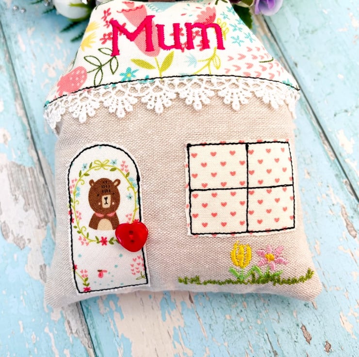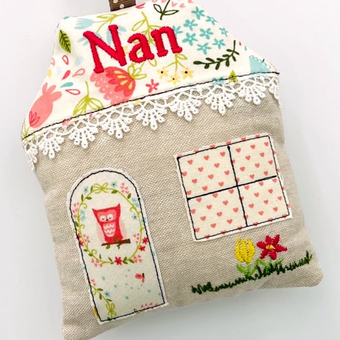 Made from a Linen fabric with appliquéd 100% cotton Fabric and a lace trim. Finished off with a button on the door and a grosgrain or satin ribbon for hanging. ( Fabric choices may vary for applique.)