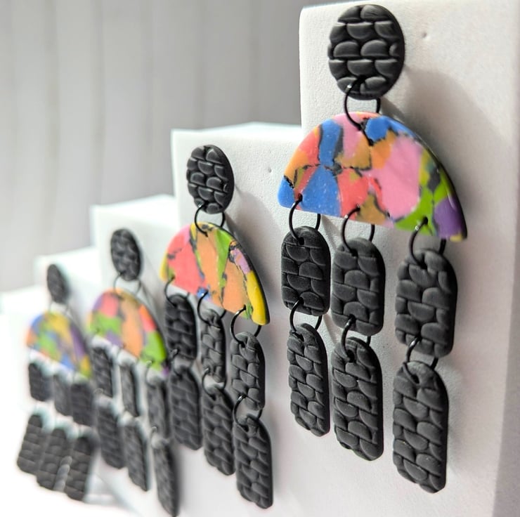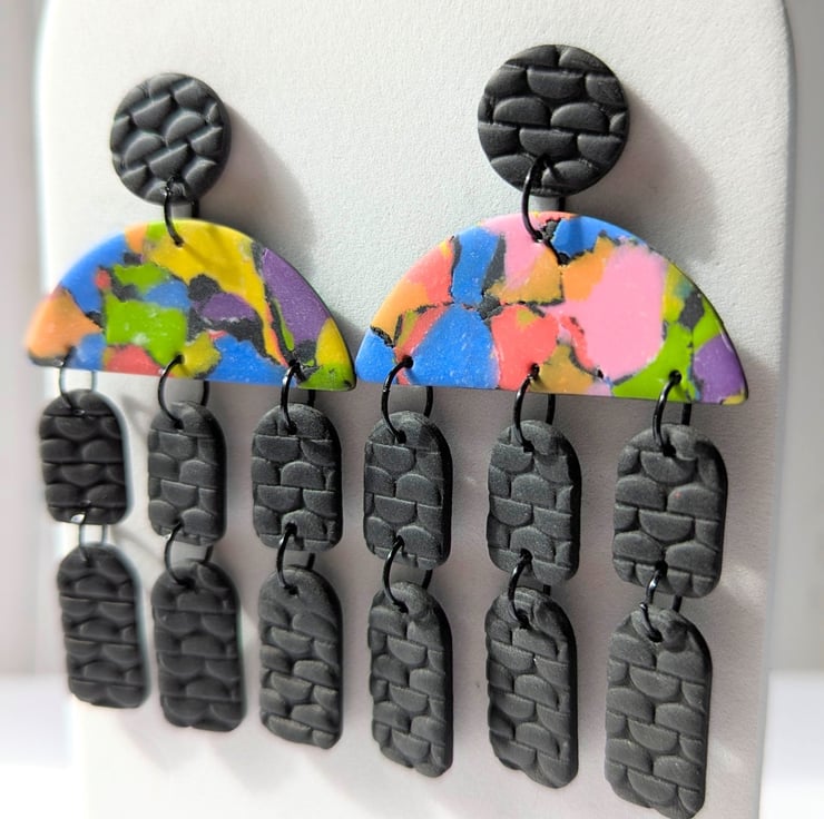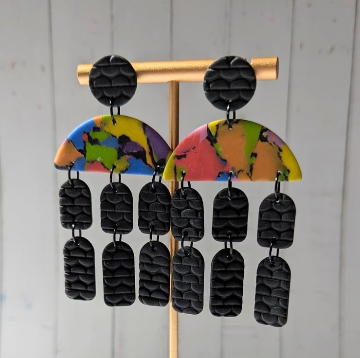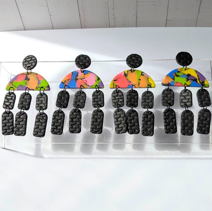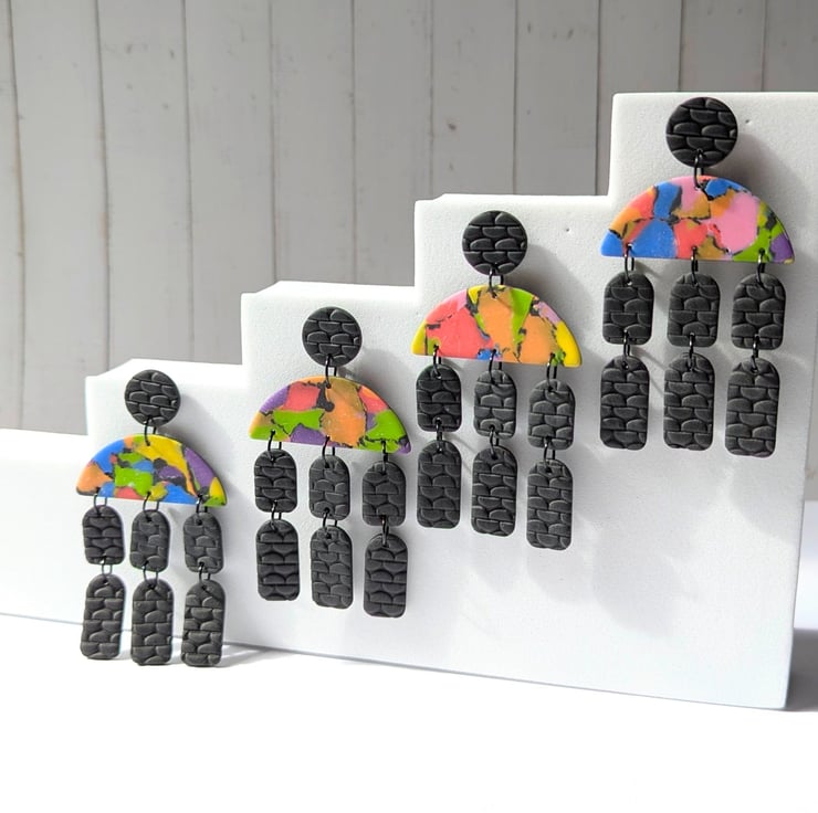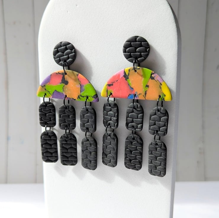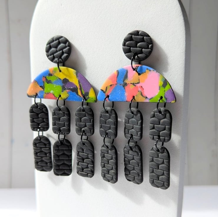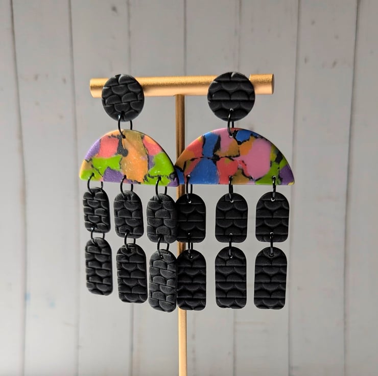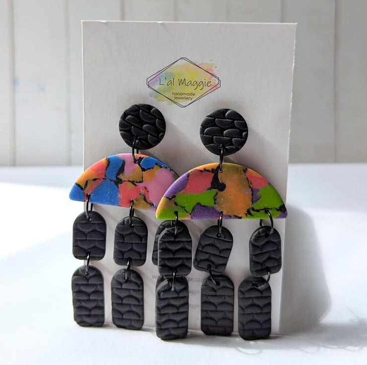 Geo multi dangle earrings in a riot of carnival colours and contrasting black textured pieces.