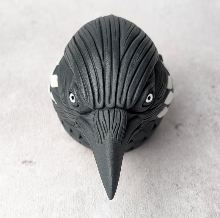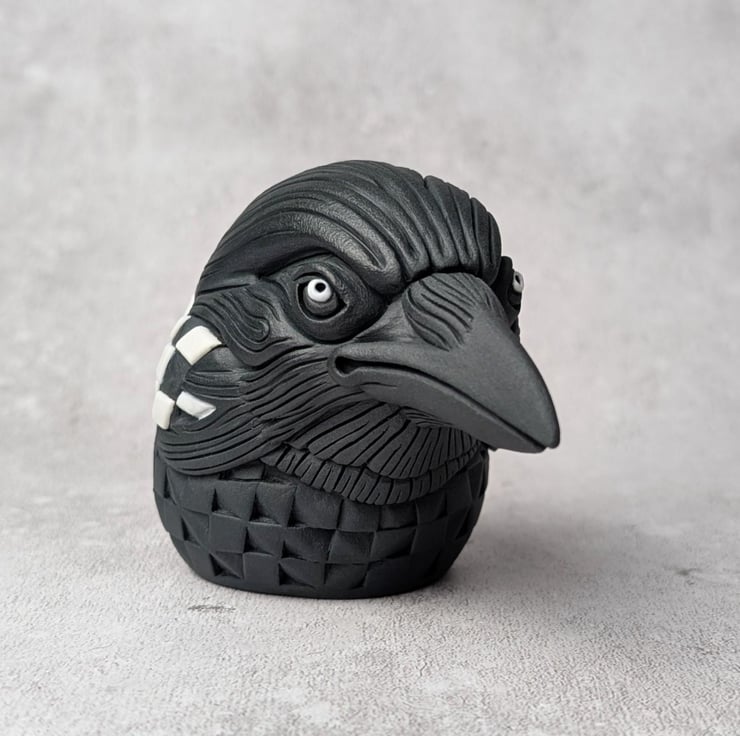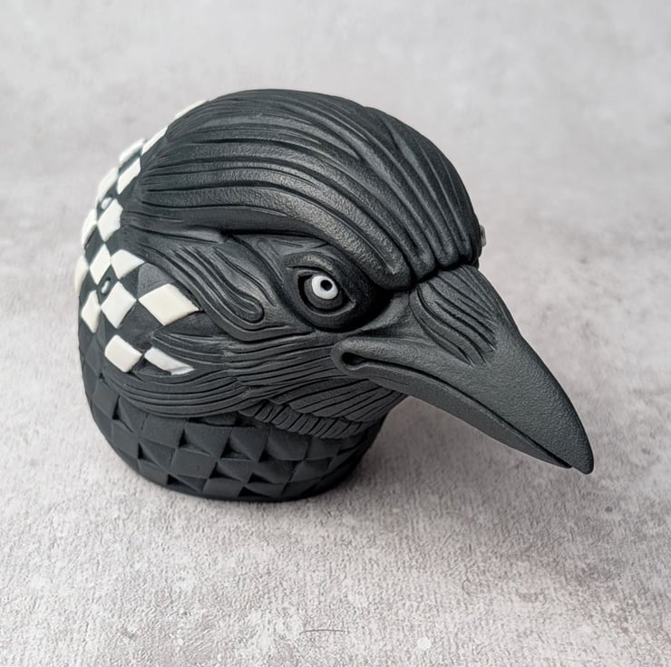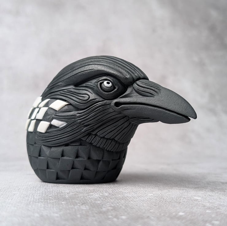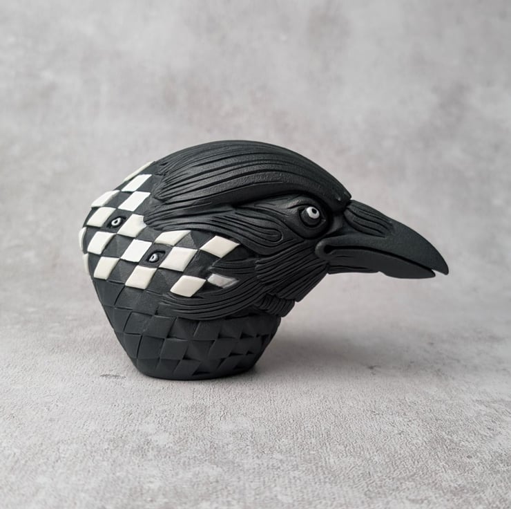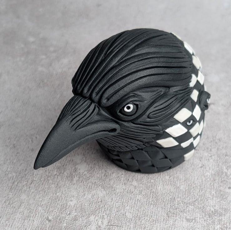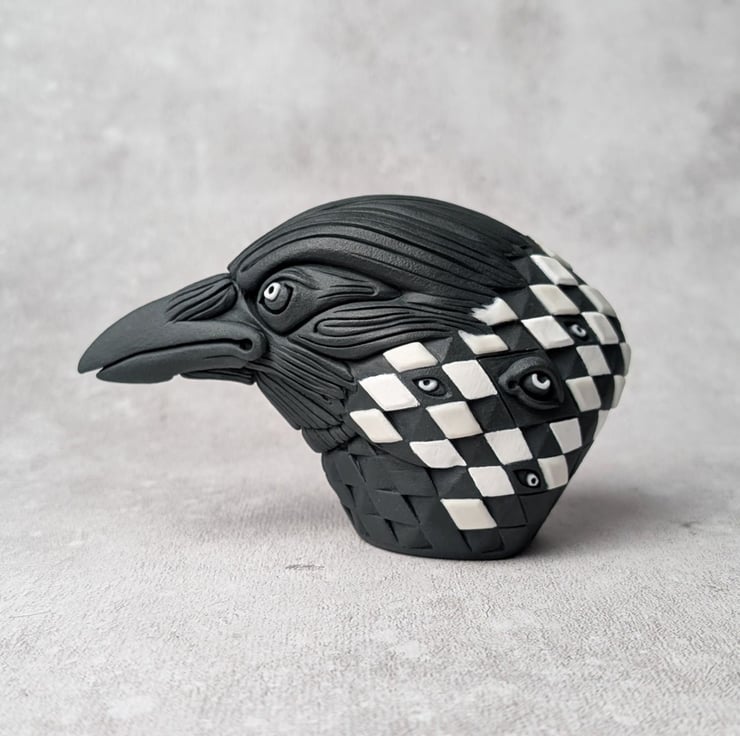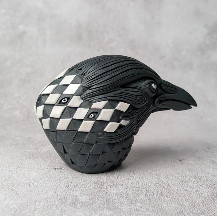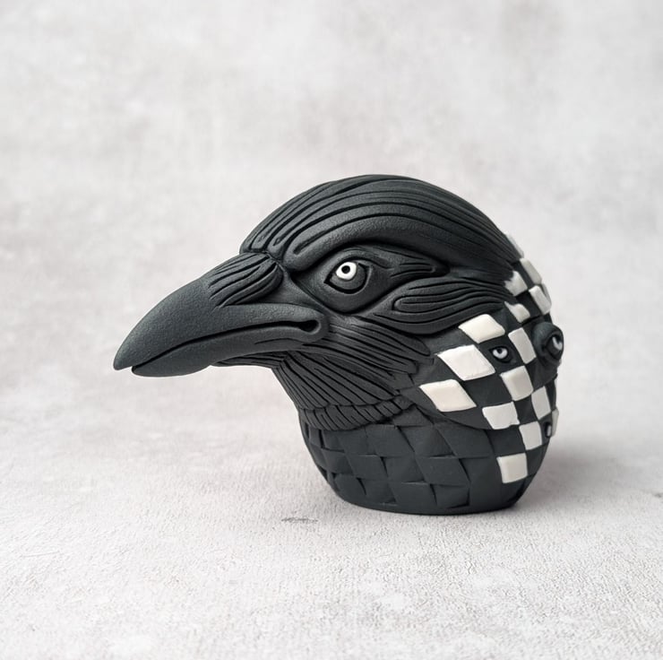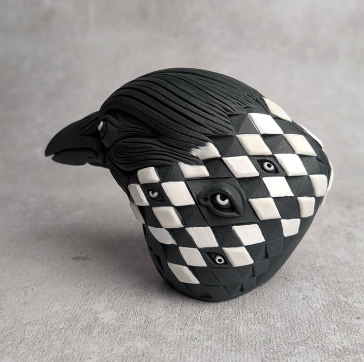 This crow idol is made primarily from black porcelain with an addition of white porcelain slip and sprigs further embellished with white enamel. Halgrim's surface is a black-and-white harlequin pattern strewn with eyes. There is something occult about this simple lattice, symbolic perhaps of the potential energy opposing forces yield when met. A third pathway emerging from duality.